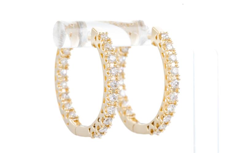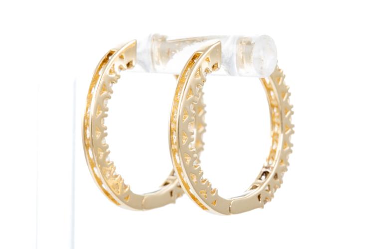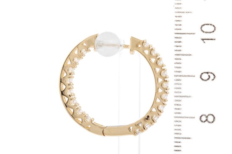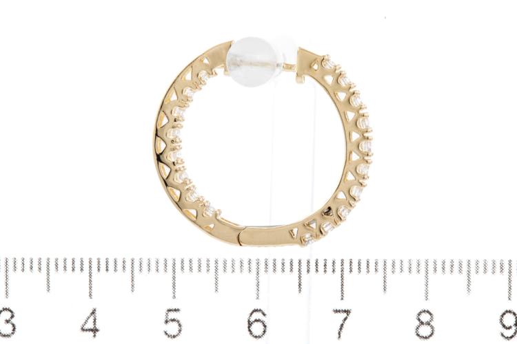 Diamond hoop earrings with 36 round Natural Diamonds totalling 1.03cts (Estimated grading: H-I SI). Back of the hoop has the Diamonds set inside the hoop. 14ct yellow gold. Diameter: 25.0mm. Weight: 6.6g. (New).
