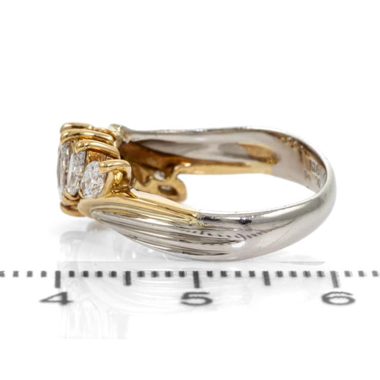Diamond dress ring with 7 marquise cut Natural Diamonds totalling 1.05cts (Estimated grading: G-H VS-SI). 18ct yellow gold and platinum 900. Ring size J. Band width: 2.8mm - 3.9mm. Weight: 4.9g. (Pre-owned)