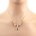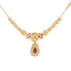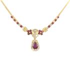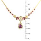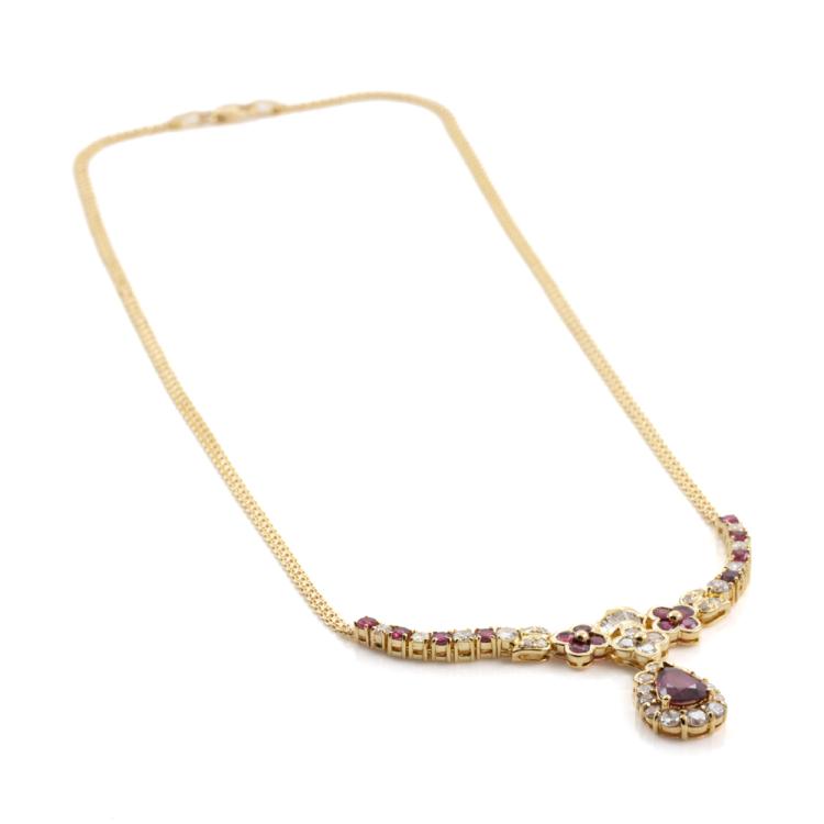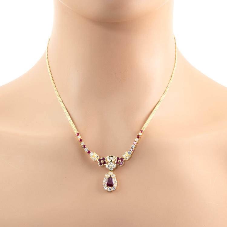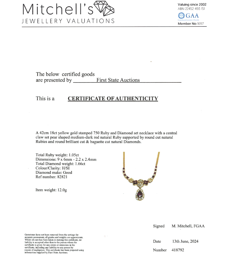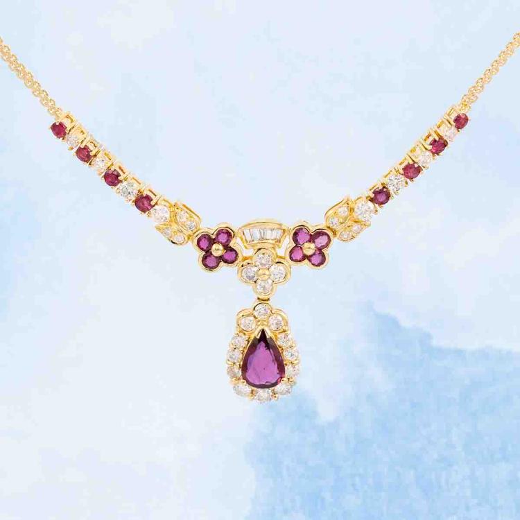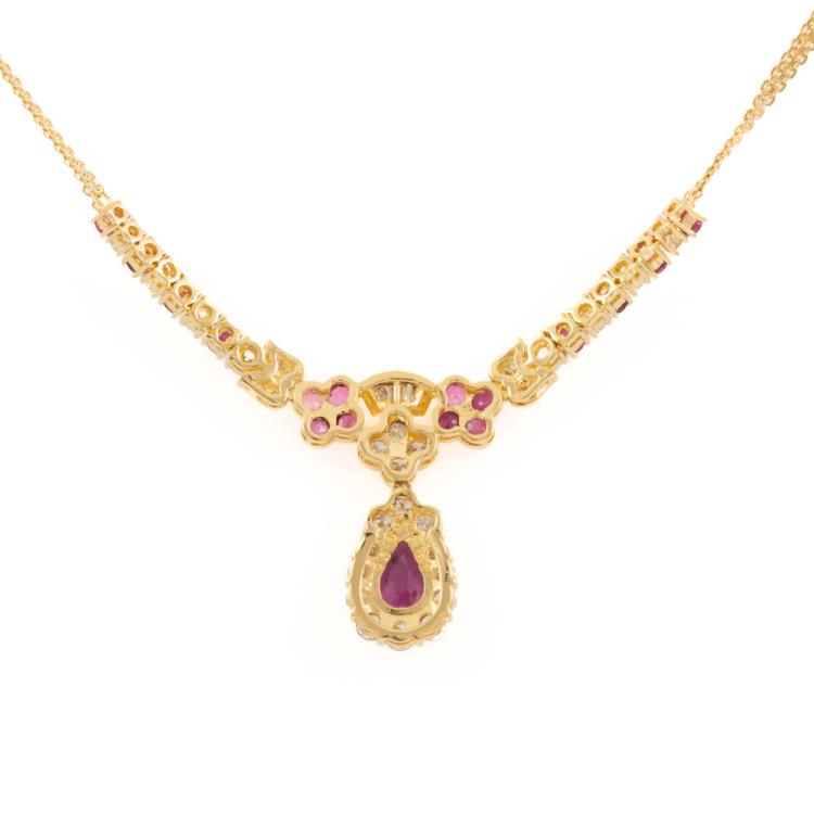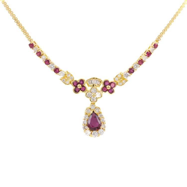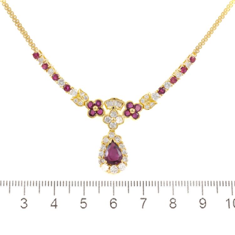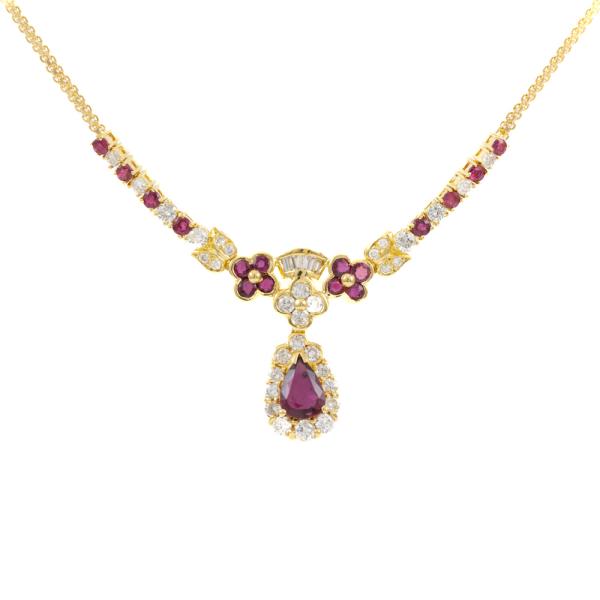 Ruby and Diamond necklace with round & pear shape natural Ruby totalling 1.05ct and round & baguette cut natural Diamonds totalling 1.66ct (Estimated grading: H SI). 18ct yellow gold. Length: 42cm. Weight: 12.0g. With Certificate #418792. (Pre-owned)