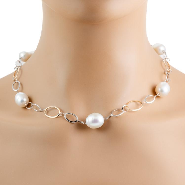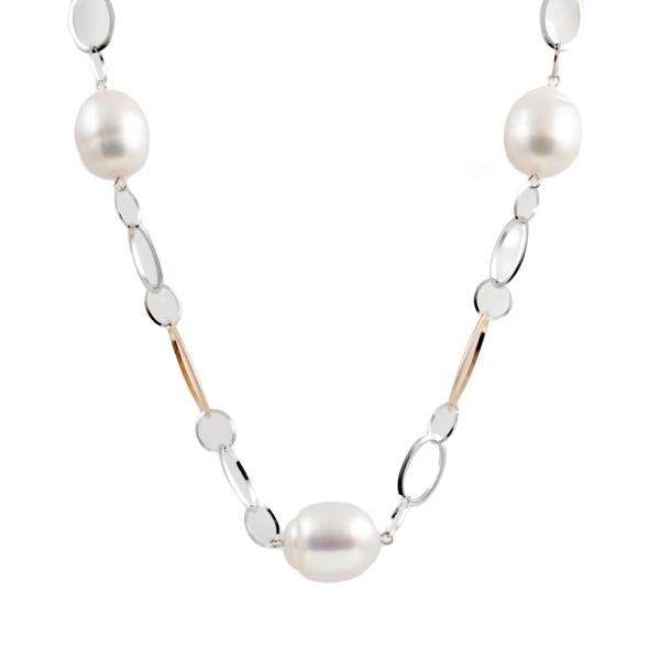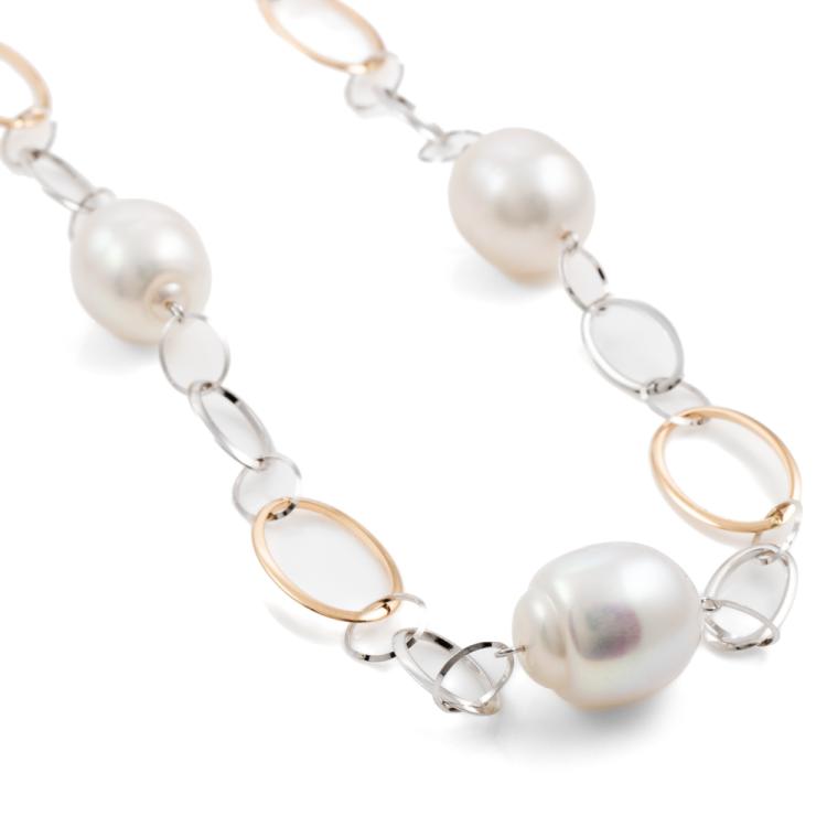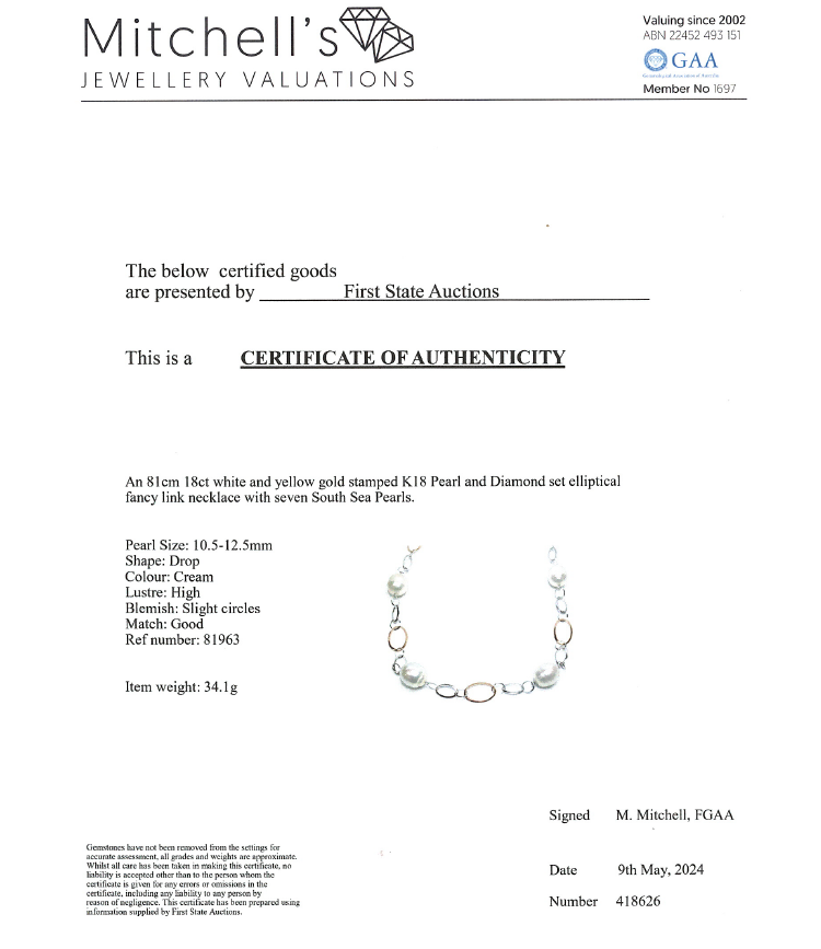 Pearl necklace with 7 drop shape slightly circle South Sea Pearls of 10.5mm-12.5mm. 18ct white and yellow gold. Length: max 81m. Weight: 34.1g. With Certificate #418626. (Pre-owned)