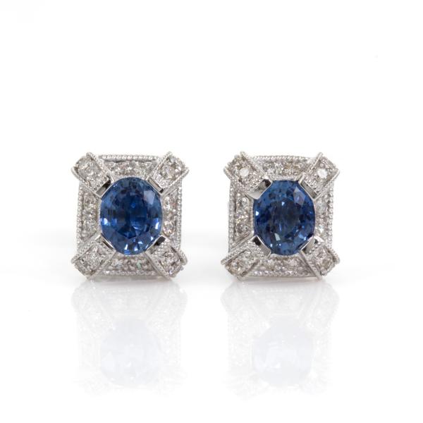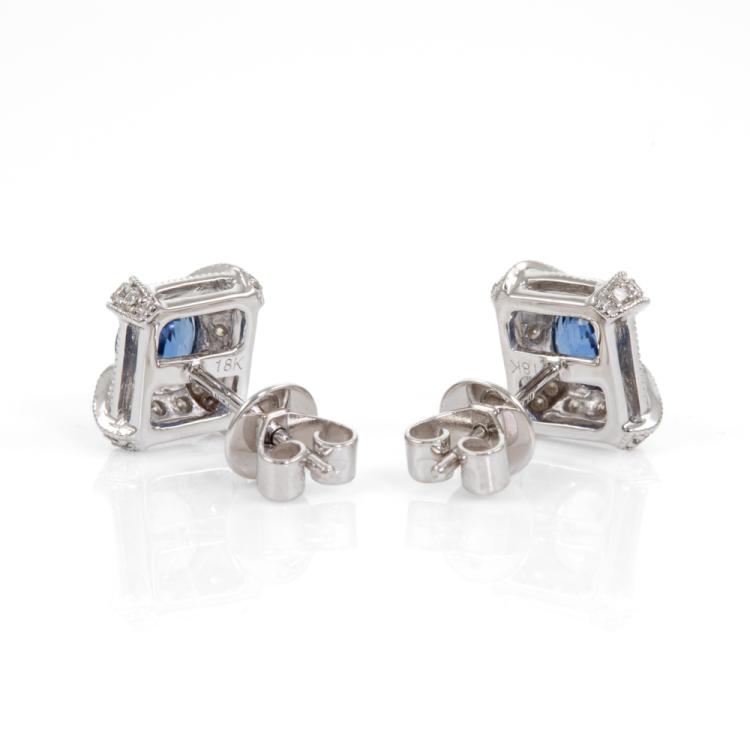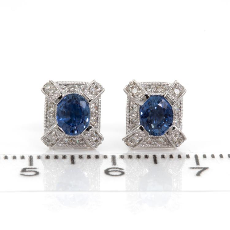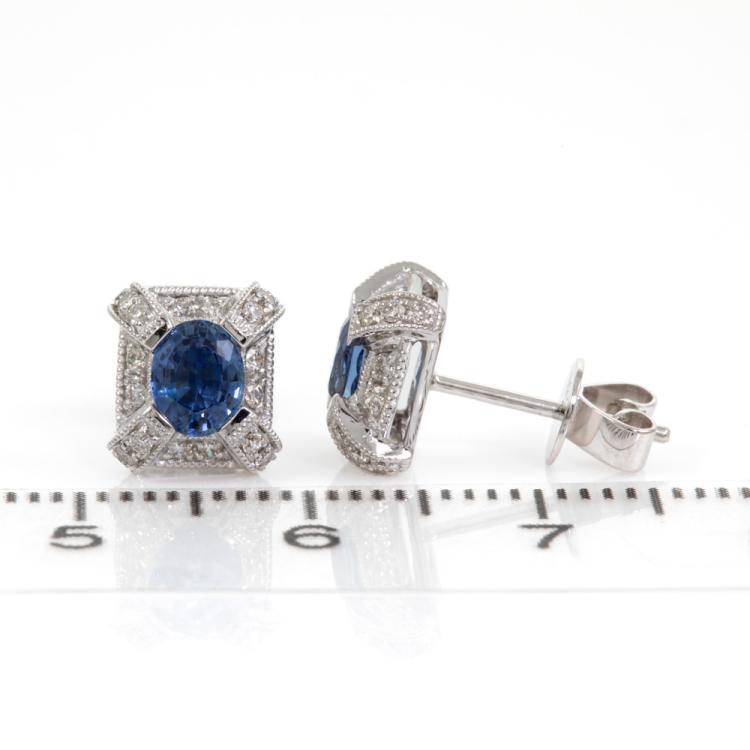 Sapphire and Diamond earrings with oval shape Natural Sapphire totalling 1.08cts and Natural round Diamonds totalling 0.25cts. 18ct white gold. Weight: 2.7g. (New)