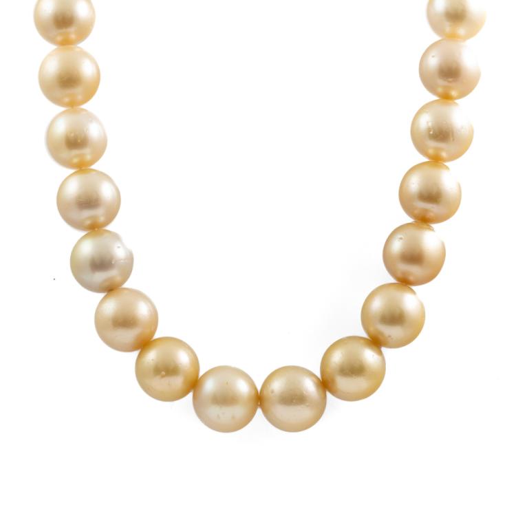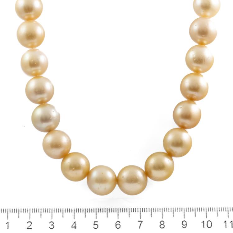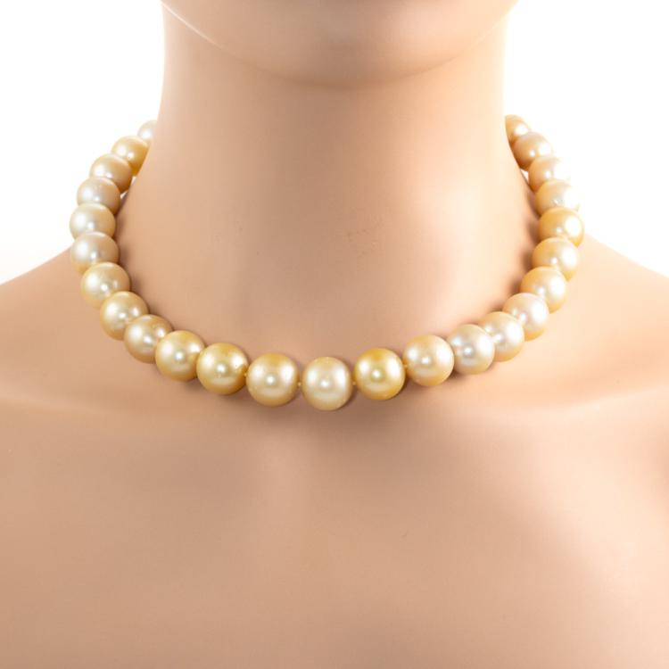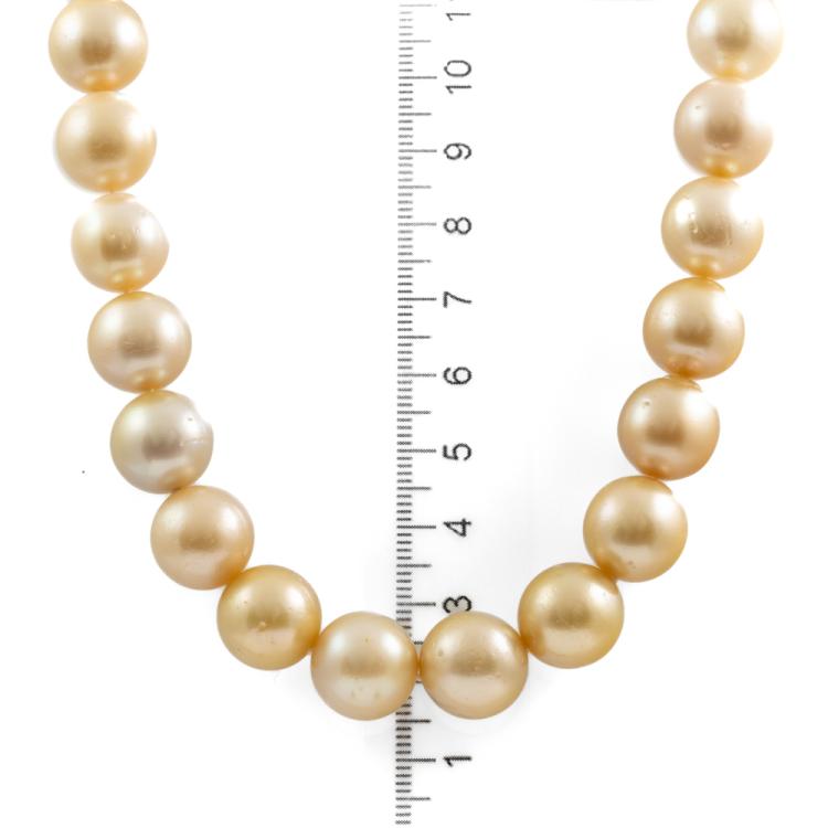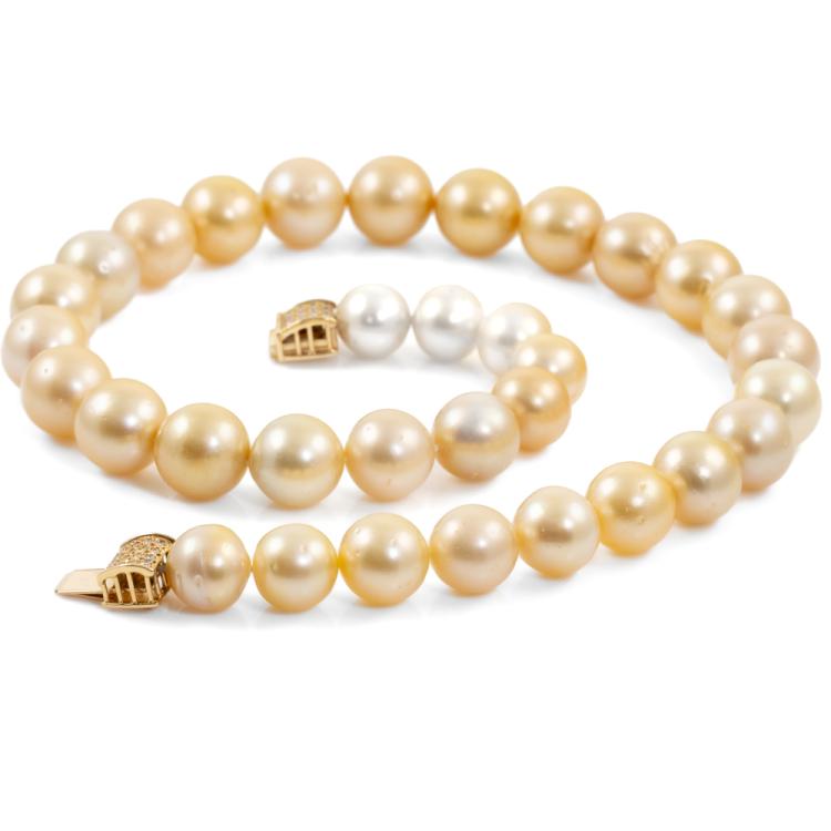Pearl necklace with 33 graduated Golden South Sea Pearls of 10.9mm - 13.8mm. 18ct yellow gold clasp set with round natural Diamonds totalling 0.42ct (Estimated grading: G SI). Length: 44cm. Weight: 99.1g. With Certificate #419039. (Pre-owned)