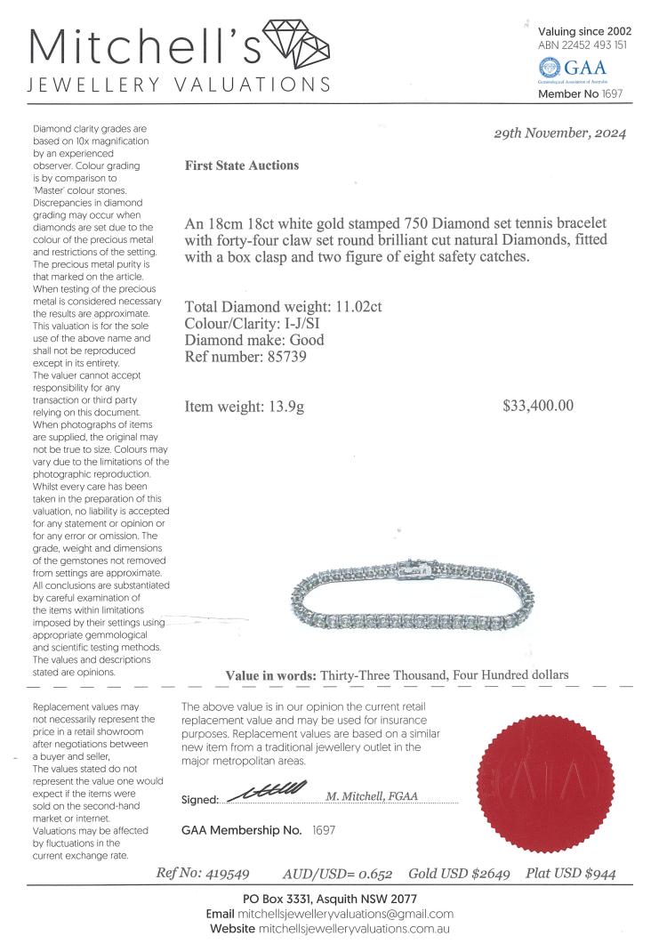 Diamond tennis bracelet with 44 round Natural Diamonds totalling 11.02ct (Estimated grading: I-J SI). 18ct white gold. Length: 18cm. Weight: 13.9g. With Certificate #419549. (New)
