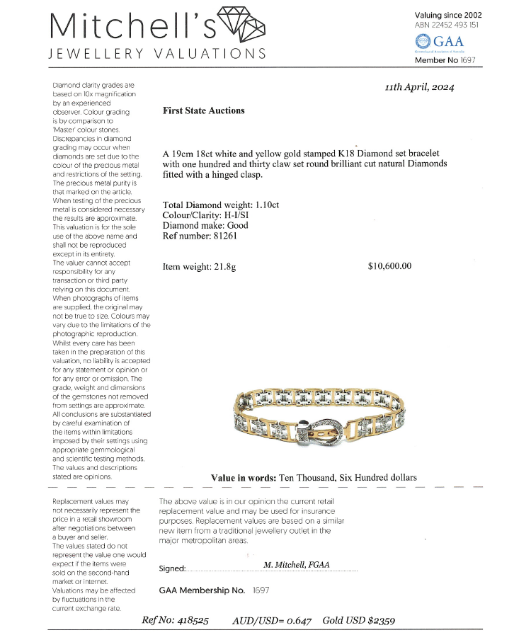 Diamond bracelet with round Natural Diamonds totalling 1.10cts (Estimated grading: H-I SI). 18ct yellow and white gold. Length: 19.0cm. Weight: 21.8g. With Valuation Certificate #418525. (Pre-owned)