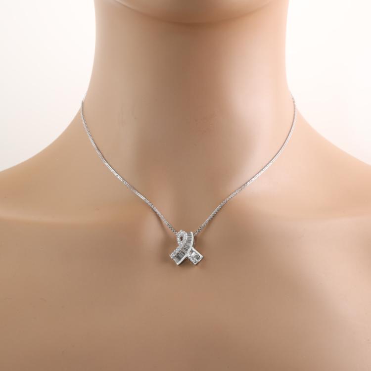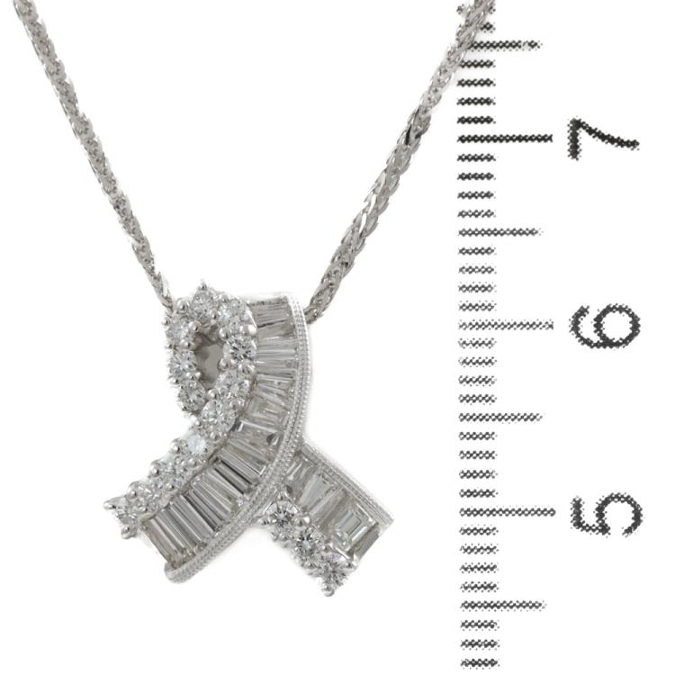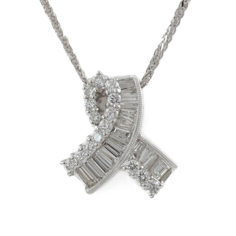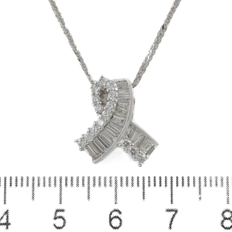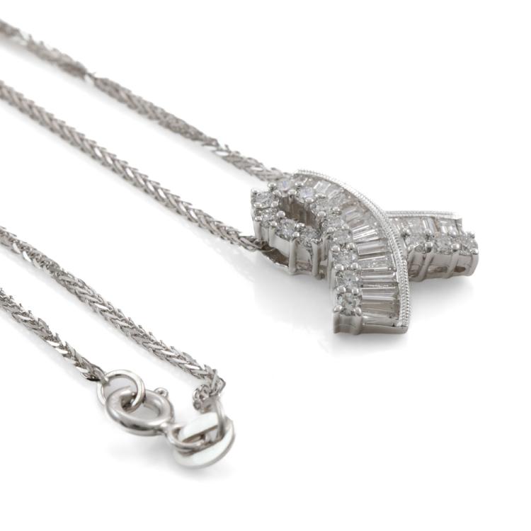 Ribbon design pendant with round & baguette cut Natural Diamonds totalling approximately 1.10ct (estimated grading: G-H VS-SI). 18ct white gold and 40cm 18ct white gold chain. Weight: 4.9g. (Pre-owned)