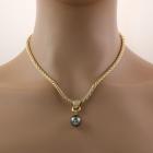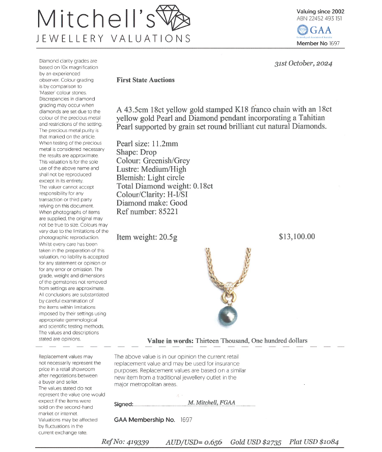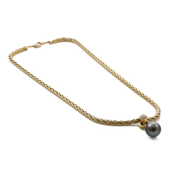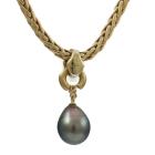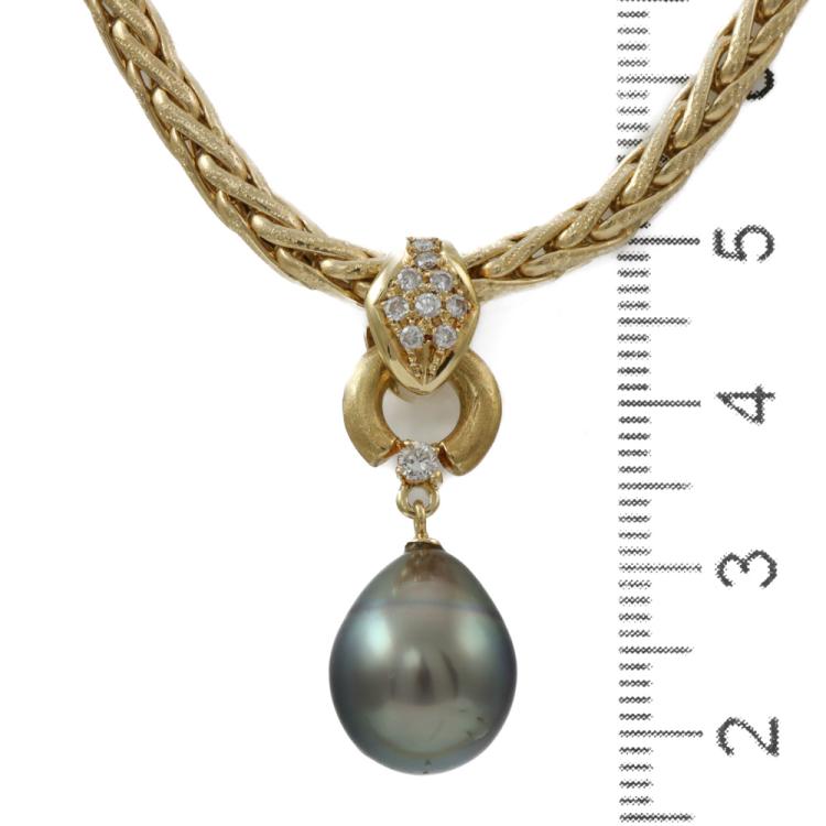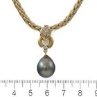 Pearl and Diamond pendant with a drop shape Tahitian Pearl of 11.2mm and round Natural Diamonds totalling 0.18ct. 18ct yellow gold with 43.5cm 18ct yellow gold franco chain. Weight: 20.5g. With Certificate #419339. (Pre-owned)