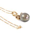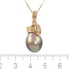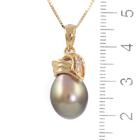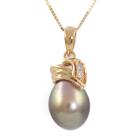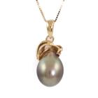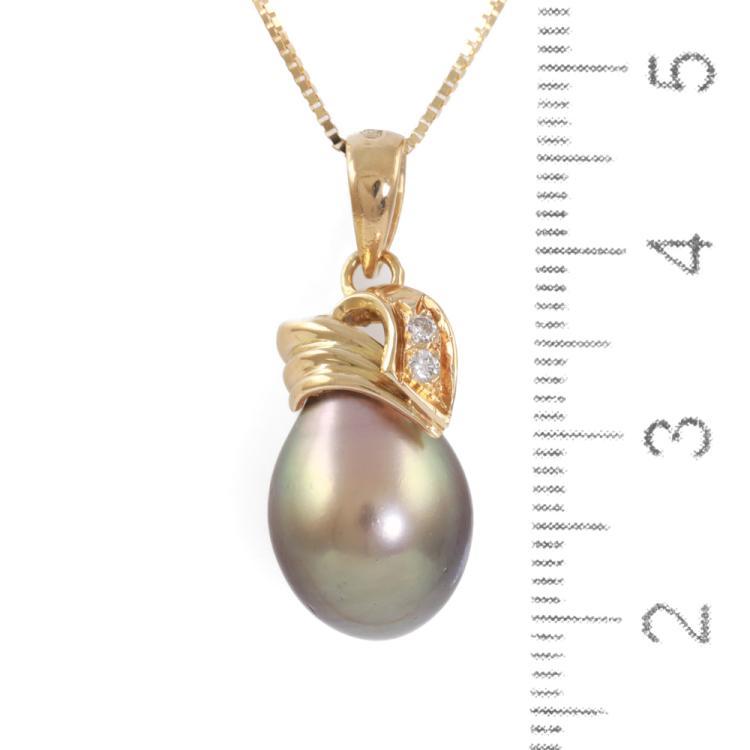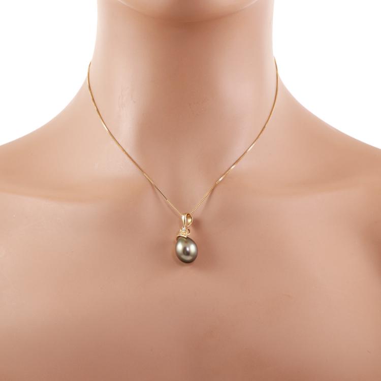 Pearl and Diamond pendant with a drop shape Tahitian pearl of 11.2mm and 2 round Natural Diamonds totalling approximately 0.04ct. 18ct yellow gold with 40cm 18ct yellow gold chain. Weight: 5.9g. (Pre-owned)