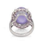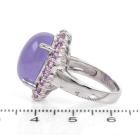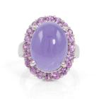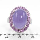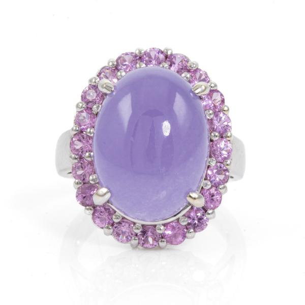 Jade and Sapphire ring with natural oval cabochon cut Lavender Jadeite Jade - Type B of 11.41ct and round natural Pink Sapphires totalling approx. 1.00ct. 14ct white gold. Ring size L. Band width: 3.2 - 4.2mm. Weight: 8.2g. (Pre-owned)
