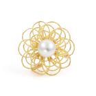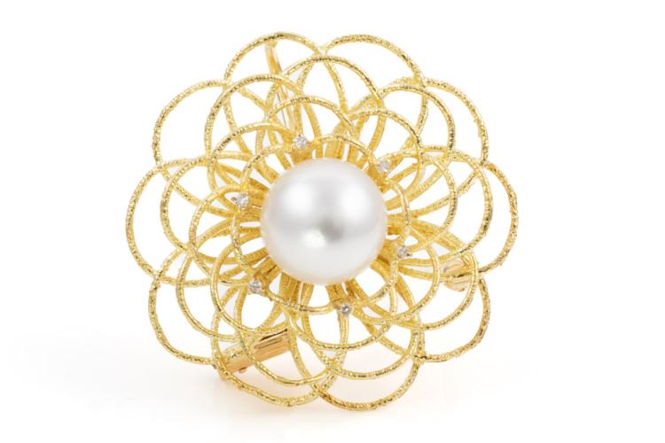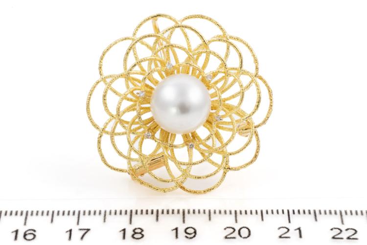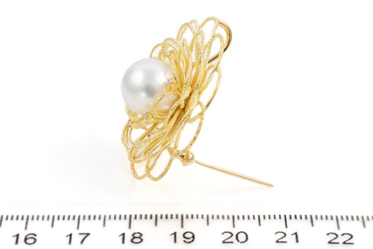 Floral design brooch/pendant with a South Sea Pearl of 11.7mm and round Natural Diamonds totalling 0.06cts. 18ct yellow gold. Item width 35.0mm. Weight: 12.1g. (Pre-owned)