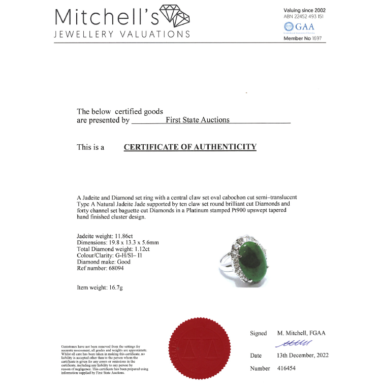 Jade and Diamond ring with oval Natural green Jadeite Jade - Type A of 11.86ct and round Natural Diamonds totalling 1.12ct (Estimated grading: G-H SI-P1). Platinum - 900. Ring size L 1/4. Weight: 16.7g. With Certificate #416454. (Pre-owned)