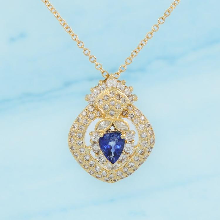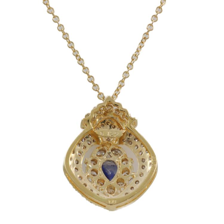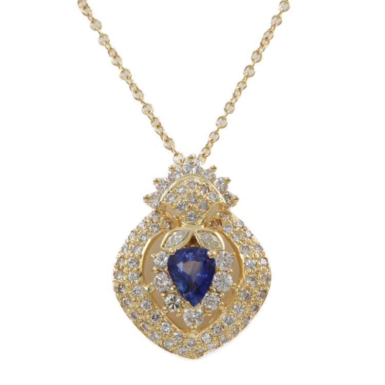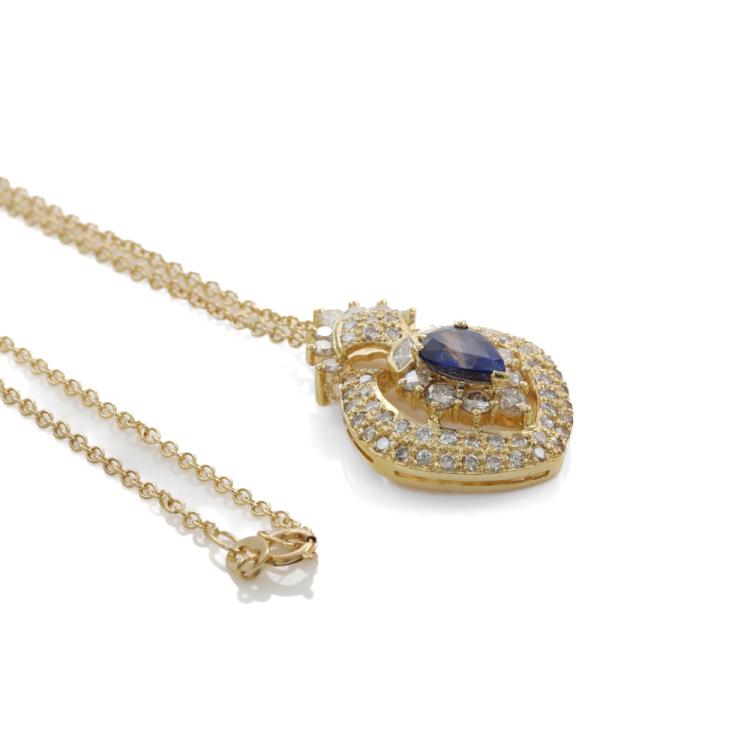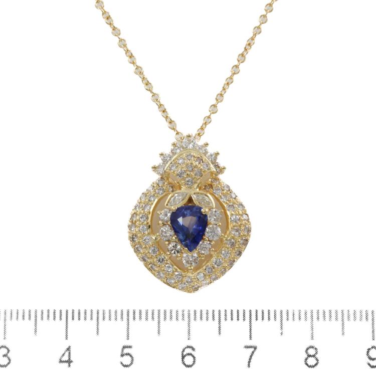 Sapphire and Diamond pendant with pear shape Natural blue Sapphire of 1.22ct and round & marquise cut Natural Diamonds totalling 1.71ct (Estimated Grading: I-K SI). 18ct yellow gold with 18ct gold 45cm chain. Weight: 8.8g. (Pre-owned)