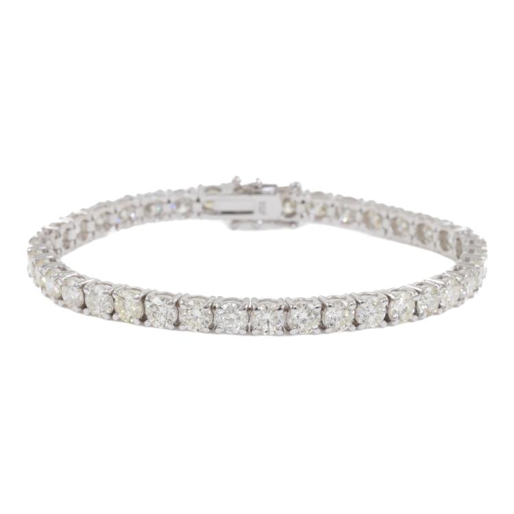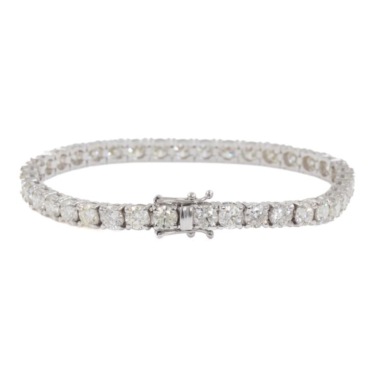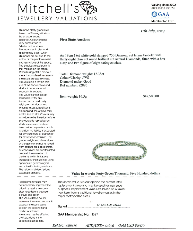 Diamond tennis bracelet with 38 round natural Diamonds Totalling 12.38ct (Estimated grading: J VS). 18ct white gold. Length: 18cm. Weight: 16.5g. With Valuation Certificate #418870. (New)