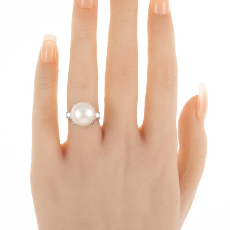Pearl & Diamond ring with a white South Sea Pearl of 12.4mm and 2 round natural Diamonds totalling 0.20ct. Platinum 900. Ring size H. Band width 2mm-3.1mm. Weight: 8.2g. (Pre-owned).