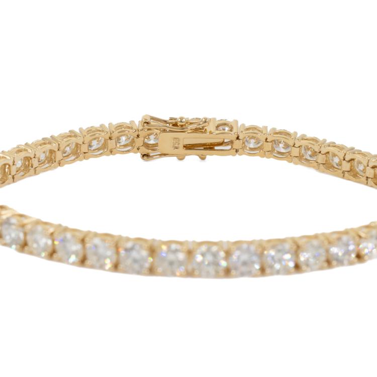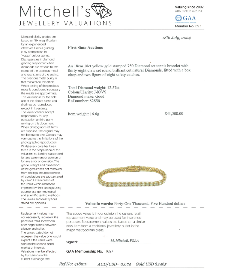 Diamond tennis bracelet with 38 round natural Diamonds totalling 12.57ct (Estimated grading: J-K VS). 18ct yellow gold. Length: 18cm. Weight: 16.6g. With Valuation Certificate #418910. (New)
