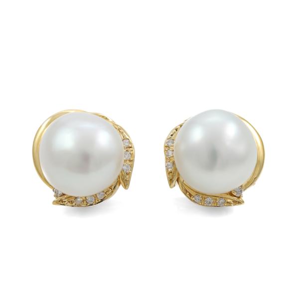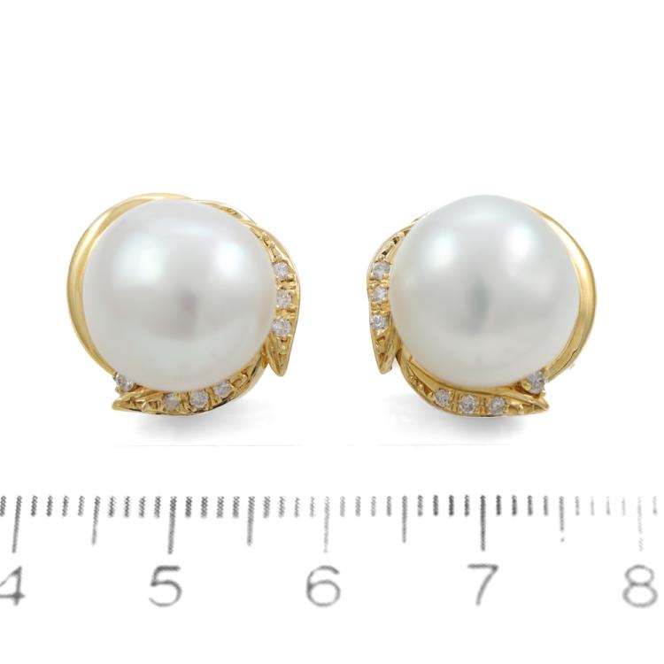 Pearl and Diamond clip-on earrings (for non pierced ears) with 2 South Sea Pearls of 12.6mm & 12.3mm and round Natural Diamonds totalling 0.16ct. 18ct yellow gold. Weight: 10.2g. (Pre-owned)