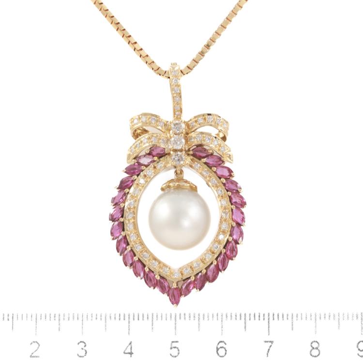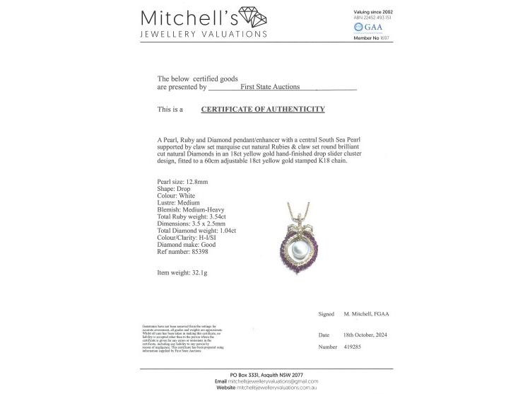 Pearl and Ruby pendant/enhancer with a South Sea Pearl of 12.8mm, marquise cut Natural Rubies totalling 3.54ct and round Natural Diamonds totalling 1.04ct (Estimated grading: H-I SI). 18ct yellow gold with 18ct yellow gold 60.0cm adjustable chain. Weight: 32.1g. With Certificate #419285. (As New)