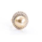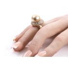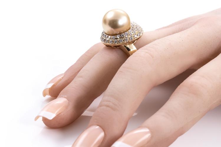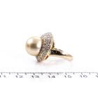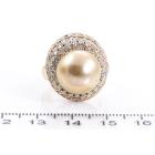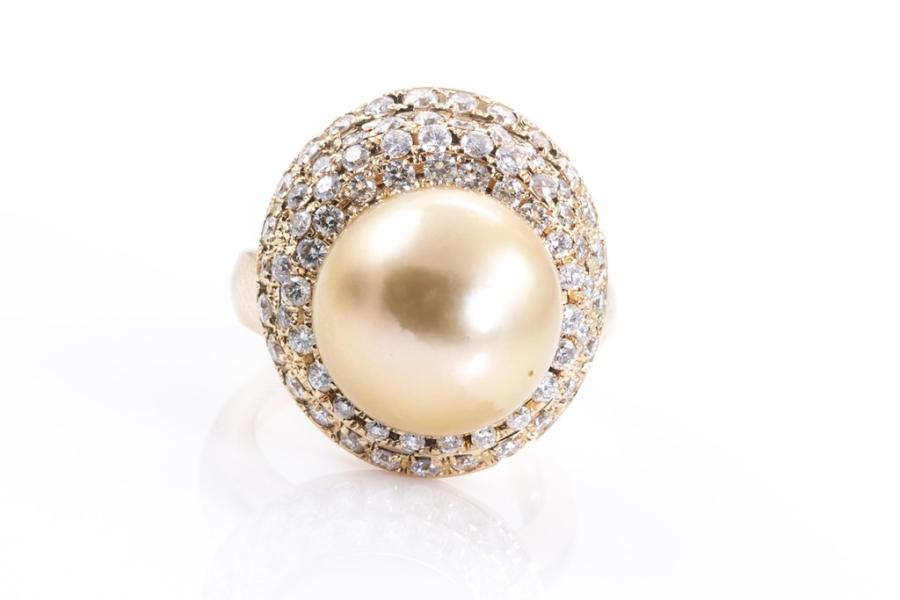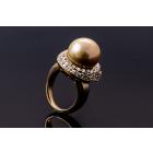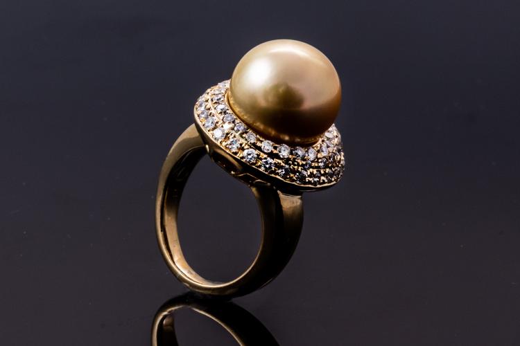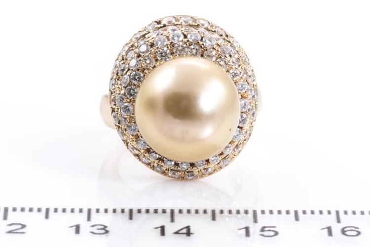 Pearl and Diamond ring with a golden South Sea Pearl of 13.0mm and round Natural Diamonds totalling 1.38ct (Estimated grading: H-I SI). 18ct yellow gold. Ring size: J. Weight: 14.9g. (Pre-owned)