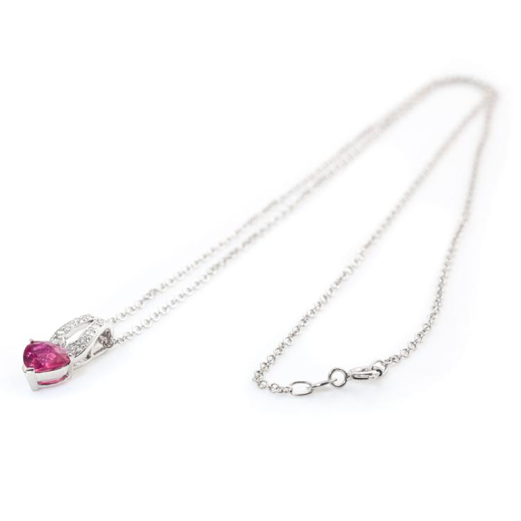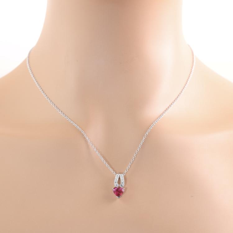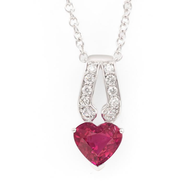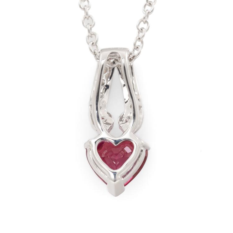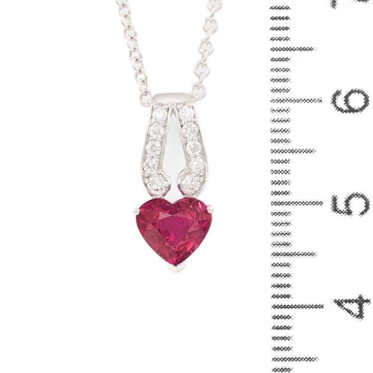 Ruby and Diamond Pendant with heart shape Natural Ruby totalling 1.34ct and round Natural Diamonds totalling 0.18ct. 18ct white gold 45cm 18ct white gold chain. Pendant size: 1.7cm x 0.8cm. Weight: 4.1g. (Pre-owned)
