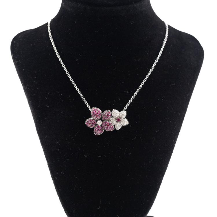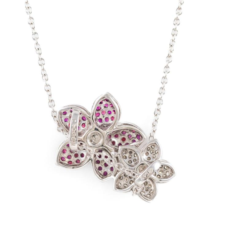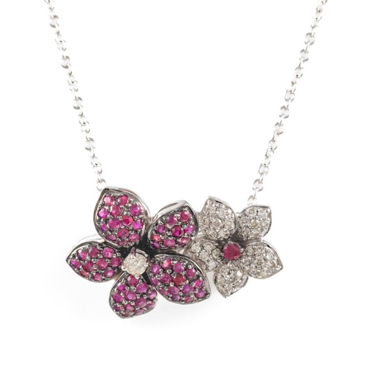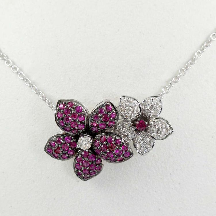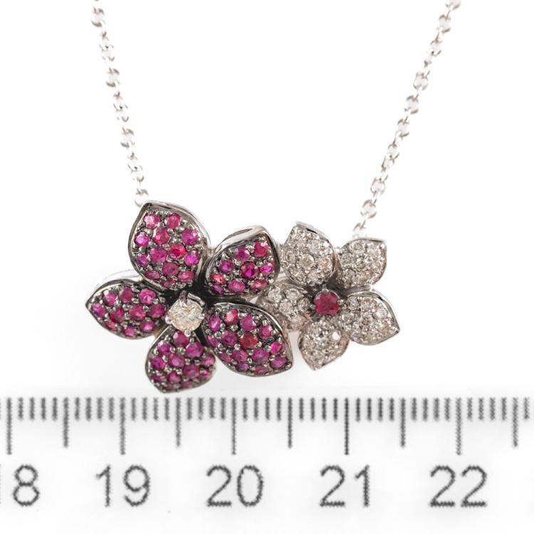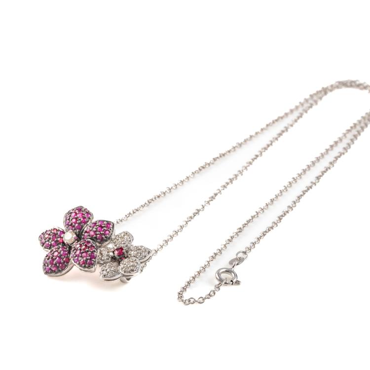 Ruby and Diamond pendant with round Natural Rubies totalling 1.35cts and round Natural Diamonds totalling 0.40cts (Estimated grading: J SI). 18ct white gold with 18ct white gold 46cm chain. Weight: 8.9g. (Pre-owned)