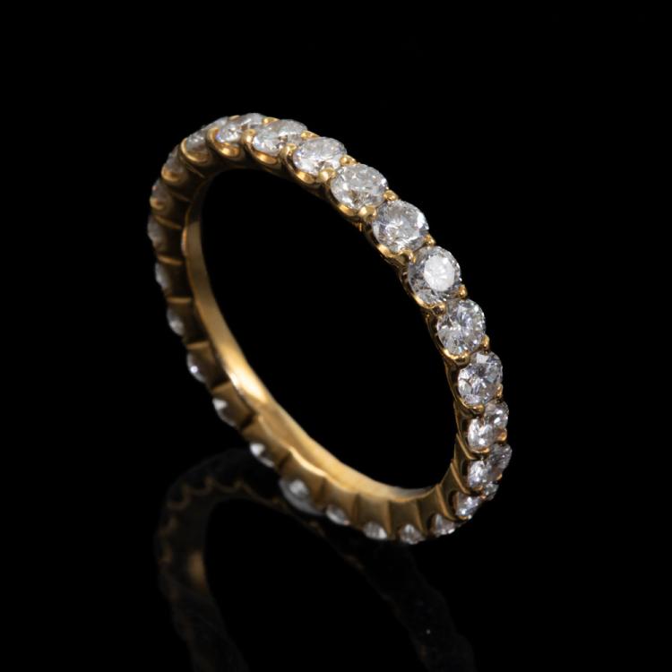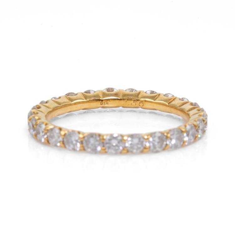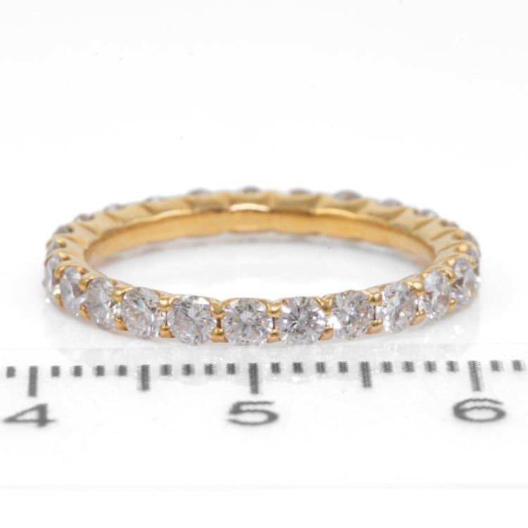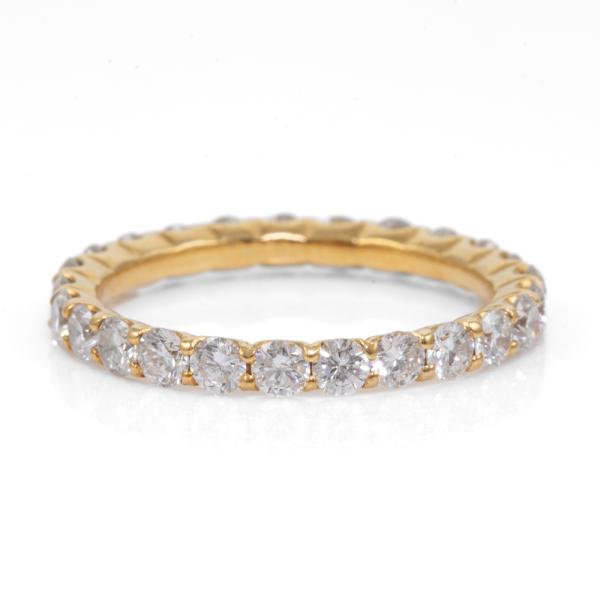 Diamond full eternity ring with round natural Diamonds totalling 1.36cts (Estimated grading: H-I SI). 18ct yellow gold. Ring size K1/2 - ring resizing is not recommended. Band width: 2.3mm. Weight: 2.1g. (Pre-owned)