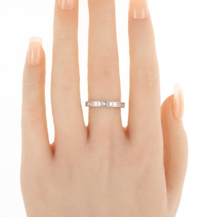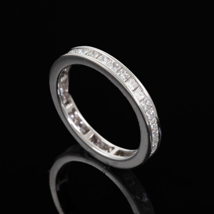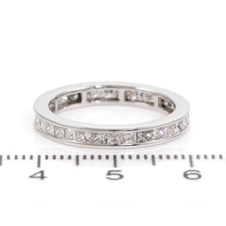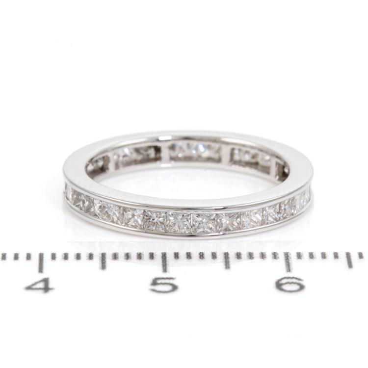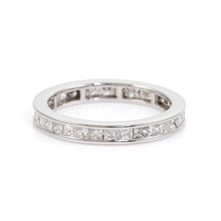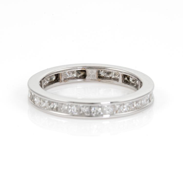 Diamond full eternity ring with princess cut Natural Diamonds totalling 1.40ct (Estimated grading: H SI). 18ct white gold. Ring size M1/2 - ring resizing is not recommended. Band width: 3mm. Weight: 2.9g. (Pre-owned)