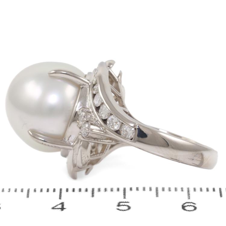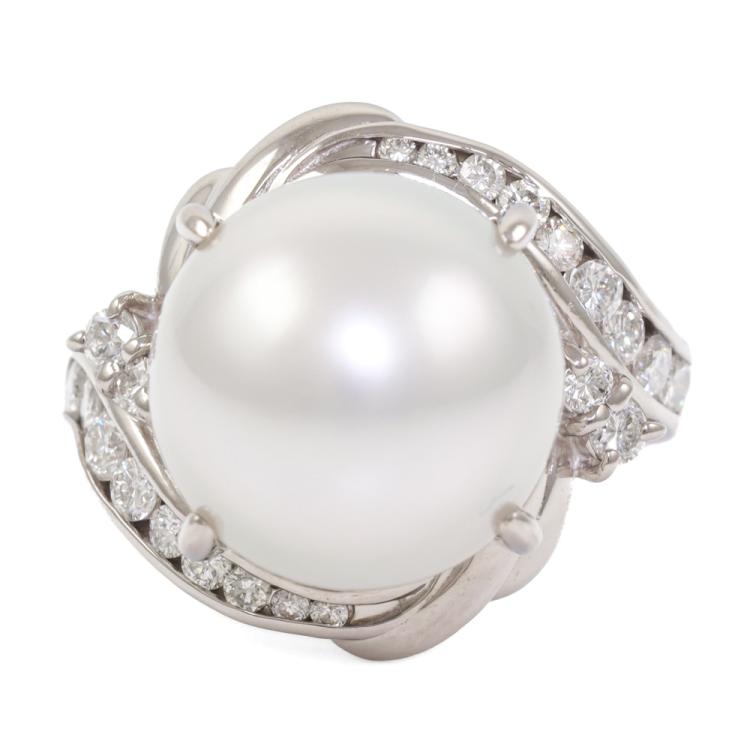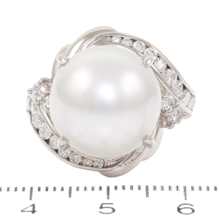 Pearl and Diamond ring with a South Sea Pearl of 14.5mm and round Natural Diamonds totalling 0.77ct. (Estimated grading: G-H SI). Platinum - 900. Ring size: M1/2. Band width: 3.3mm-4.7mm. Weight: 17.5g. (Pre-owned)
