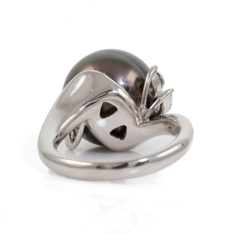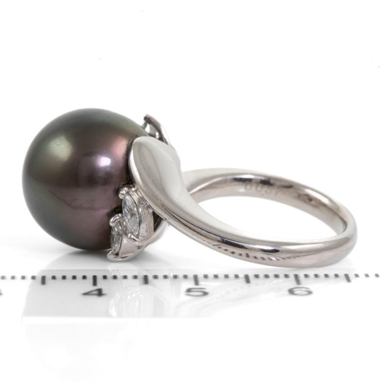 Pearl and Diamond ring with a Tahitian Pearl of 14.5mm and marquise cut Natural Diamonds totalling 0.37ct (Estimated grading: G-H SI). Platinum 900. Ring size N. Band width: 2.9mm. Weight: 16.6g. (Pre-owned)