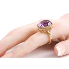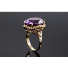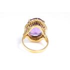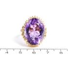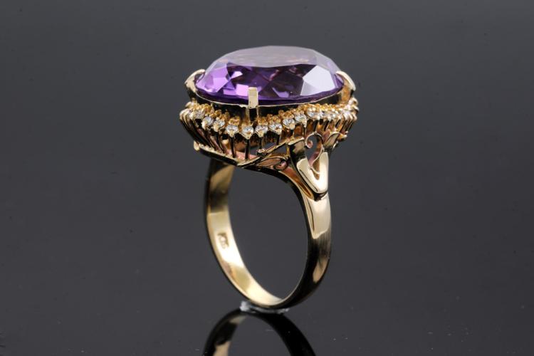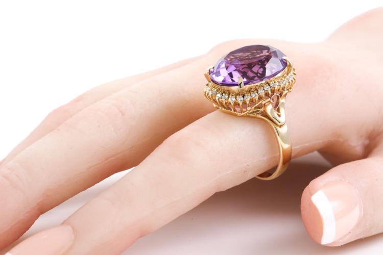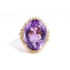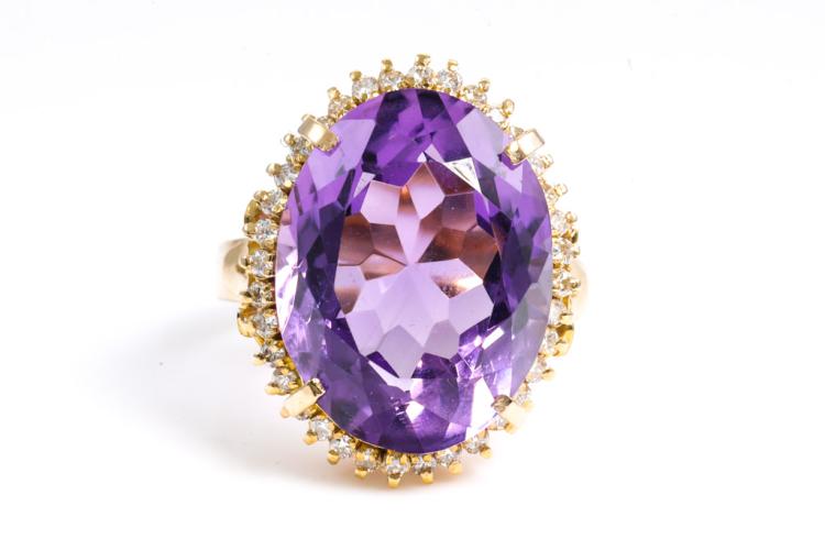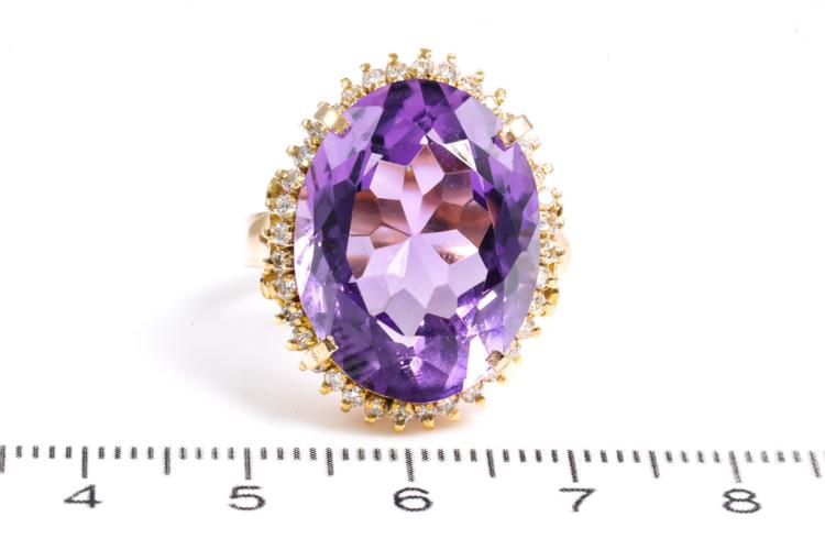 Amethyst and Diamond ring with oval shape Amethyst of approximately 14.98ct and round Diamonds totalling 0.54cts (Estimated grading: H SI). 18ct yellow gold. Ring size S. Weight: 13.2g. (Pre-owned)