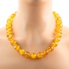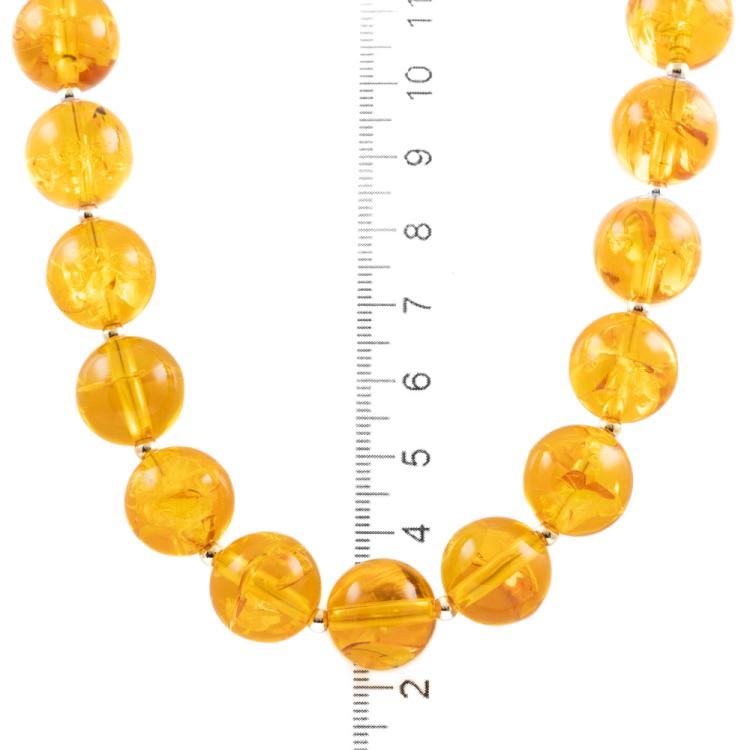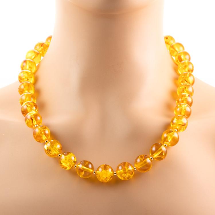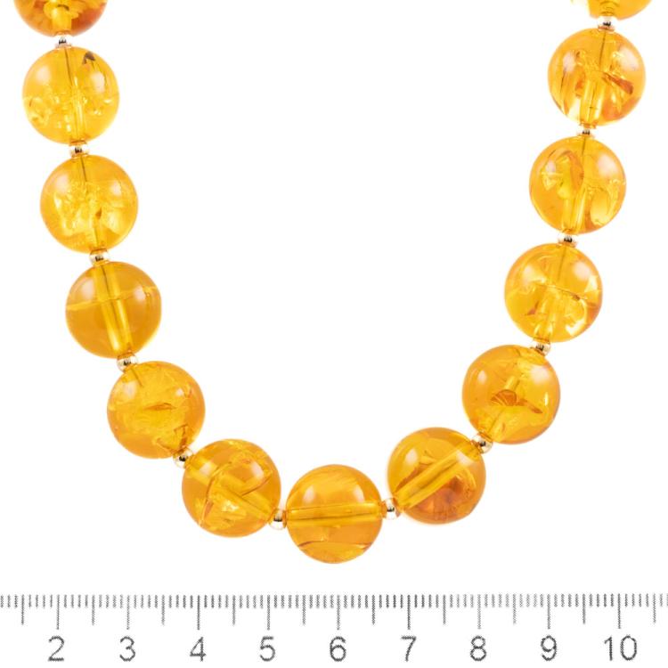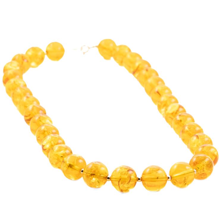 Amber necklace with round Natural Amber stones of 14.0mm and gold beads. 18ct yellow gold clasp. Length 53cm. Weight: 56.8g (Pre-owned)