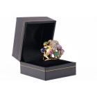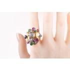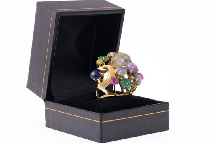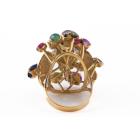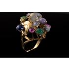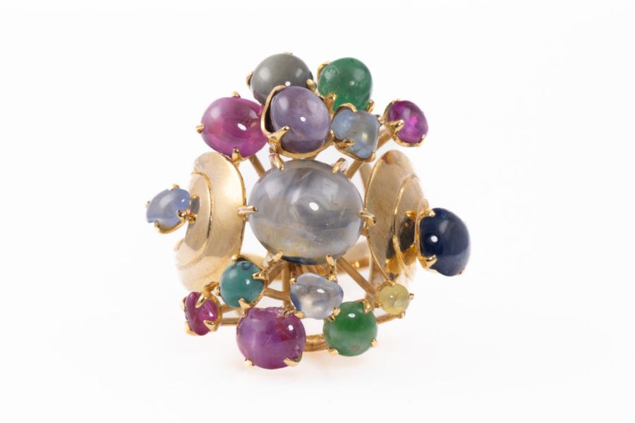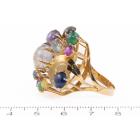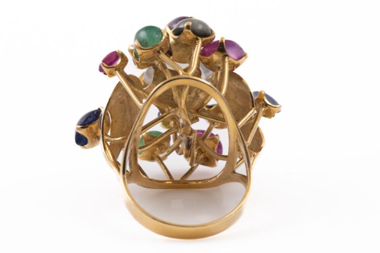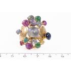 Ring with multi-coloured cabochon cut Gemstones (including Sapphires, Emerald and Turquoise) totalling approximate 15.00cts. 18ct yellow gold. Ring size N. Weight: 13.3g. Note: some stones with surface reaching inclusions. (Pre-owned)