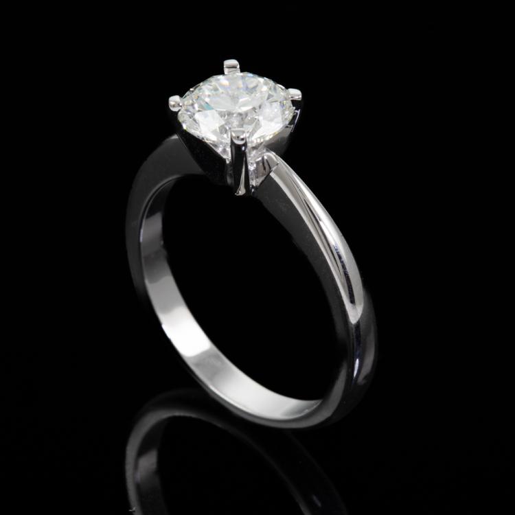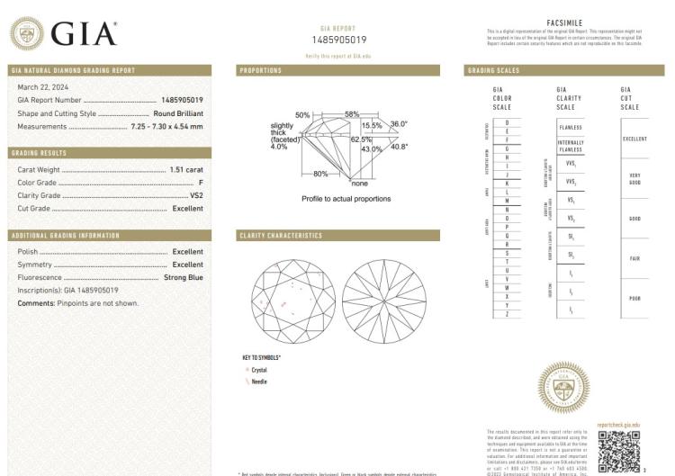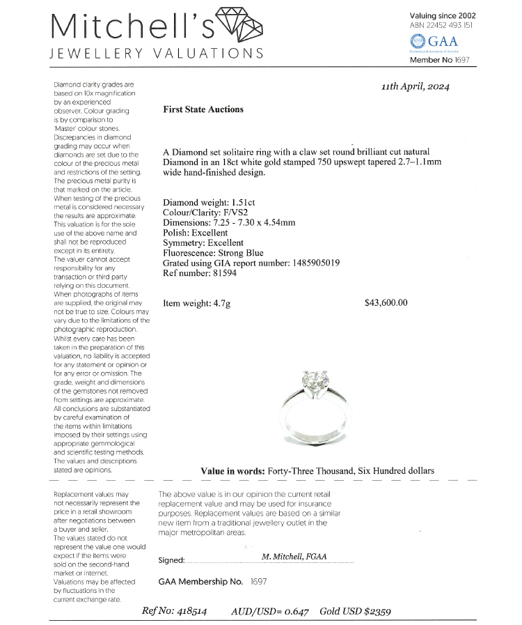 Diamond solitaire ring with round brilliant cut Natural Diamond of 1.51ct (with GIA Report graded as F VS2 #1485905019). 18ct white gold. Ring size M. Band width 2.7mm - 1.1mm. Weight: 4.7g. With Valuation Certificate #418514. (New)