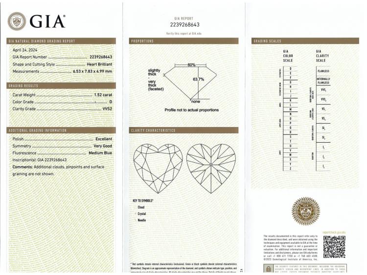 A loose heart shape Natural Diamond of 1.52ct (with GIA Report graded as D VVS2 #2239268643). (New)