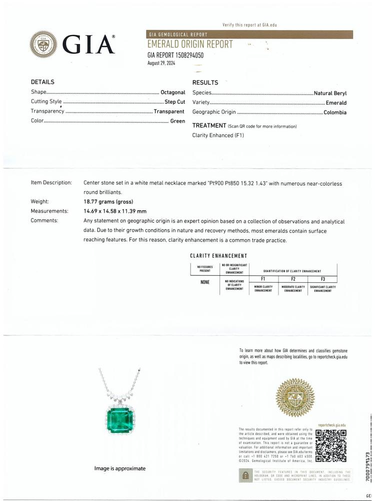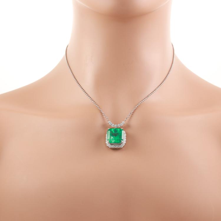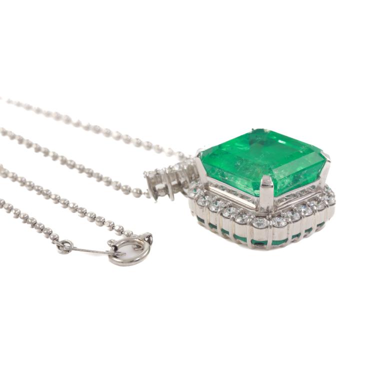 Emerald and Diamond pendant with emerald cut Natural Colombian Emerald of 15.32ct (with GIA Report #1508294050) and round Natural Diamonds totalling 1.43ct (Estimated grading: G-H VS-SI). Platinum- 900 with platinum-850 40cm chain. Weight: 18.9g. (Pre-owned)