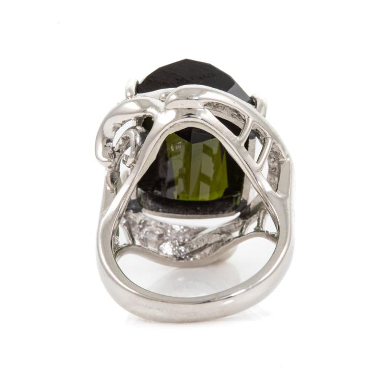 Tourmaline and Diamond ring with fancy cut Natural Tourmaline of 15.77ct and round Natural Diamonds totalling 0.08ct. Platinum 900. Ring size I1/2. Band width: 4.7mm - 2.9mm. Weight: 16.4g. (Pre-owned)