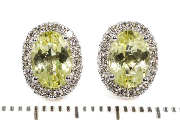 Lemon Quartz and Diamond earrings with oval checkerboard cut Lemon Quartz totalling 1.57ct and Diamonds totalling 0.27ct. 14ct white gold. Weight: 2.5g. (New)^