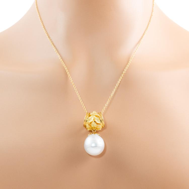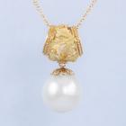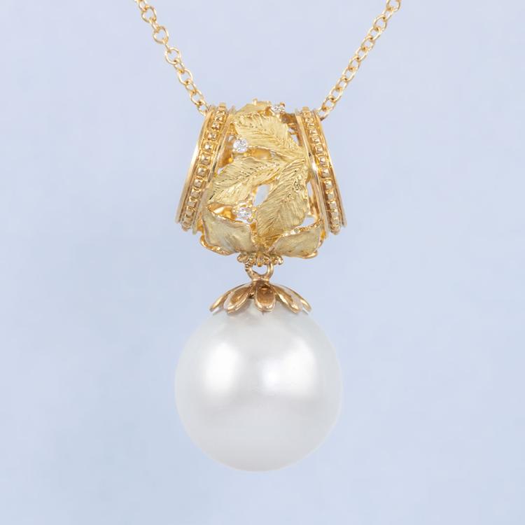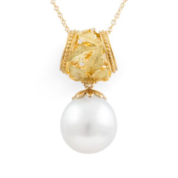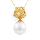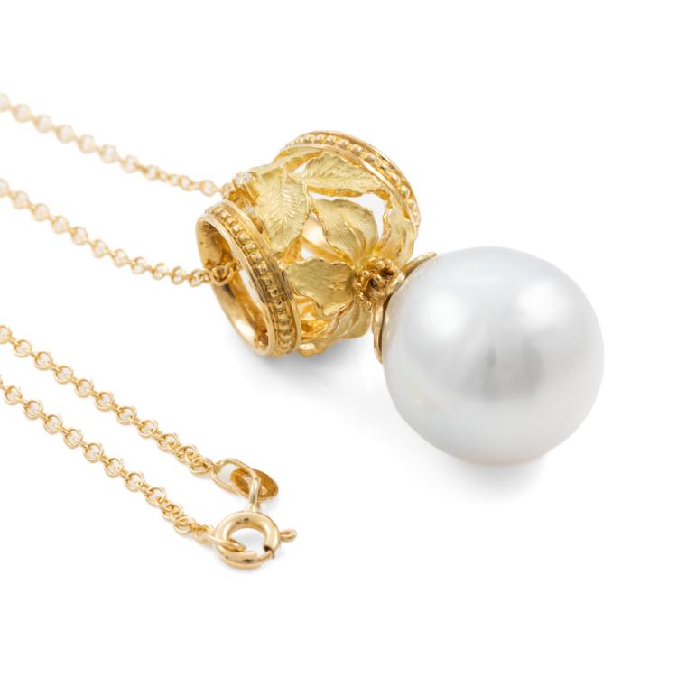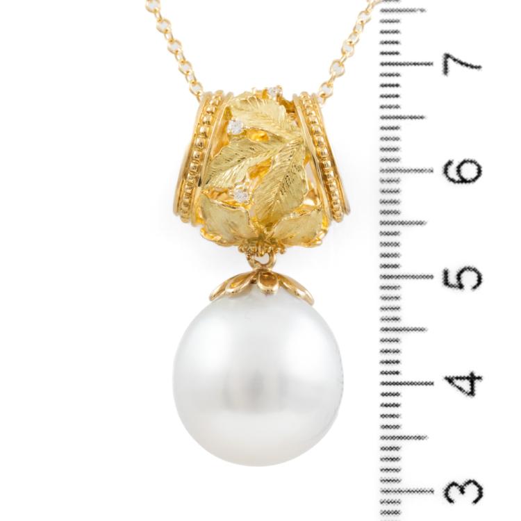 Pearl and Diamond Pendant with a white South Sea Pearl of 15.8mm and round Natural Diamonds totalling 0.05ct. 18ct yellow gold with 18ct yellow gold 45.0cm chain. Weight: 15.7g. (Pre-owned)