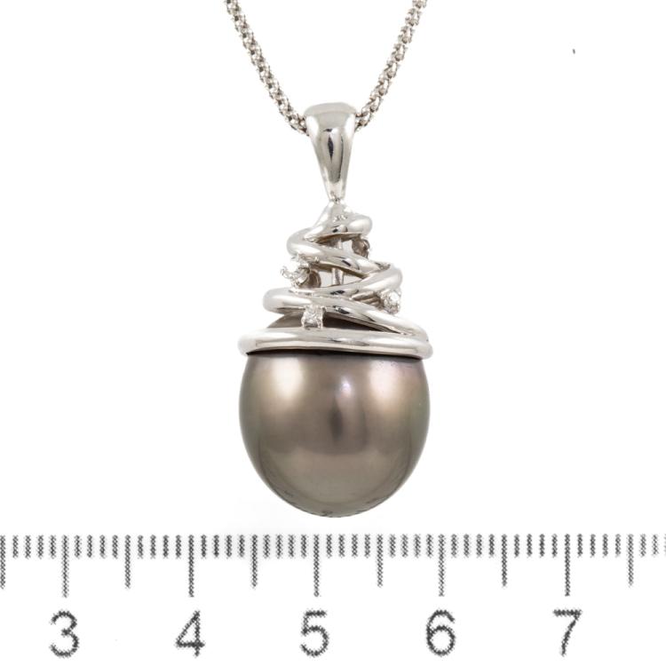 Pearl and Diamond pendant with Baroque Tahitian Pearl of 15mm and round Natural Diamonds totalling 0.04ct. 18ct white gold with 50cm 18ct white gold adjustable chain. Weight: 12.9g. (Pre-owned)