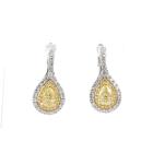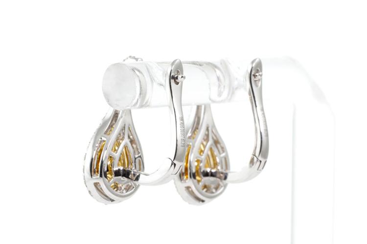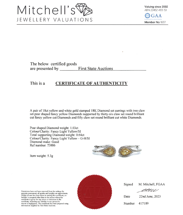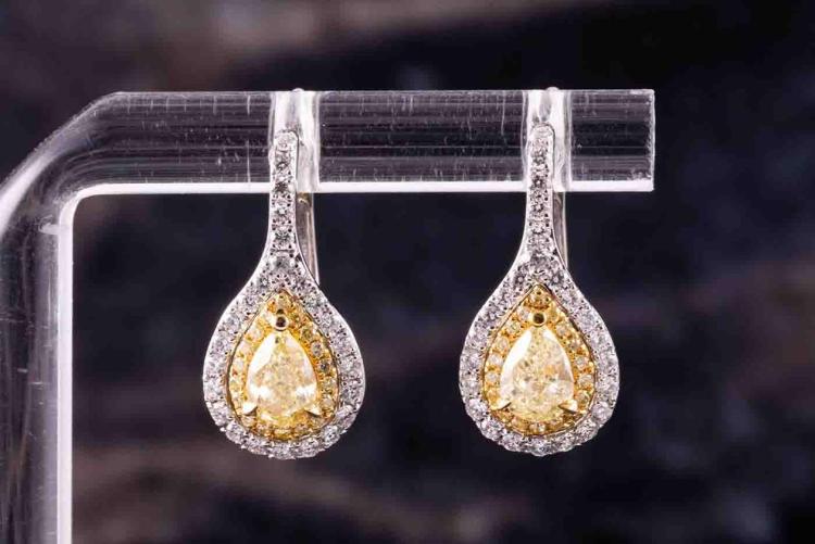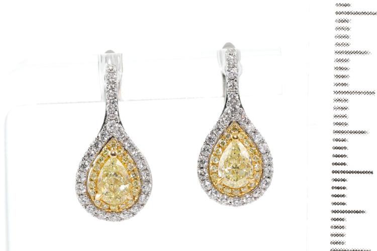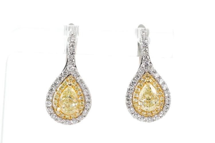 Yellow and White fancy colour Diamond clip-on earrings (for pierced ears) with 2 pear shape Fancy Yellow natural Diamonds totalling 1.03cts (Estimated grading: Fancy Light Yellow SI) and remaining round natural Diamonds totalling 0.64cts (Estimated grading: Fancy Light Yellow & G-H SI). 18ct yellow and white gold. Weight: 5.3g. With certificate #417189. (As new)