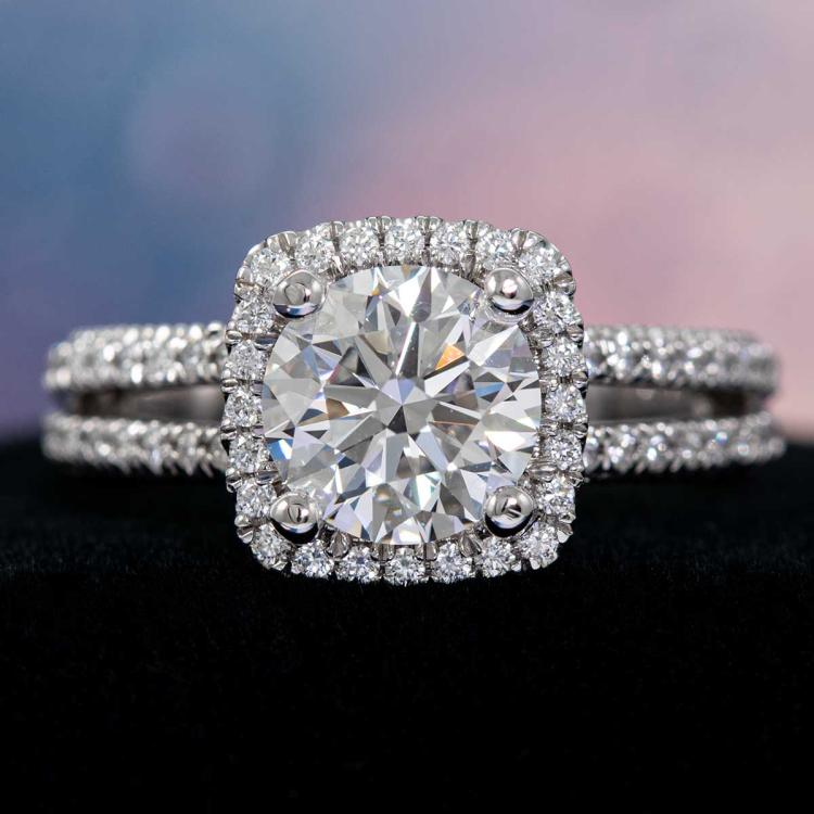 Diamond halo ring with centre round brilliant cut Natural Diamond of 1.75ct (with GIA Report graded as E VVS1 #6224795698) and surrounding round Natural Diamonds totalling approximately 0.34cts (Estimated grading: F-G VS). Platinum (stamped PLAT, XRF tested 95.59%). Engraved "Verragio". Ring size J½ - ring resizing is not recommended. Band width: 3.5mm. Weight: 8.2g. With Verragio box. (Pre-owned)