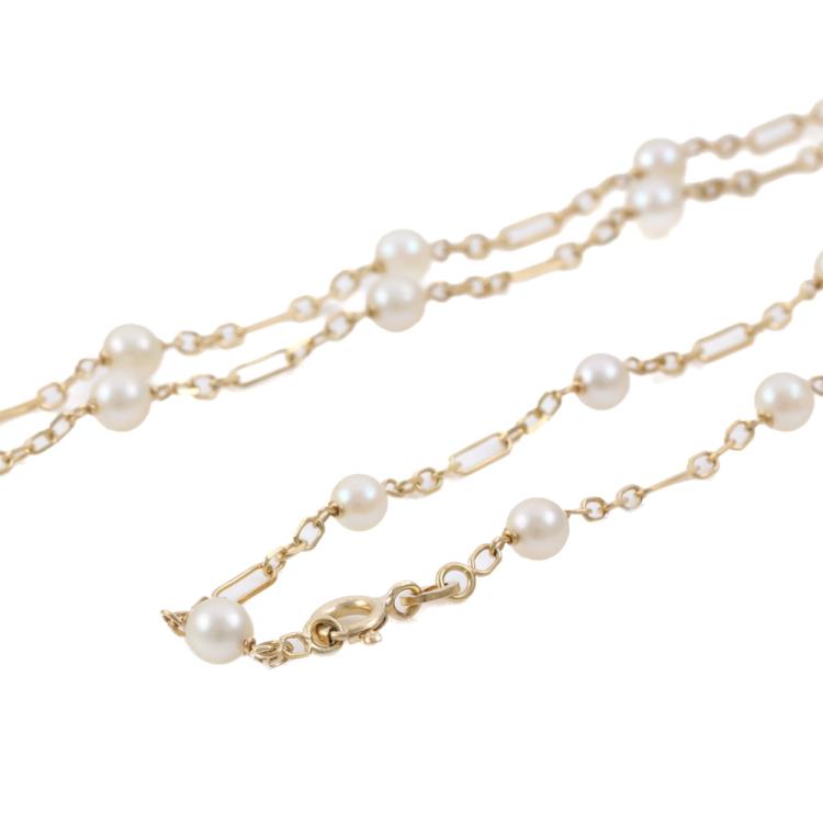 Pearl necklace with 25 cultured Pearls of 4.5-4.9mm. 18ct yellow gold with spring ring clasp. Length: 70cm. Weight: 9.7g. (Pre-owned)