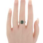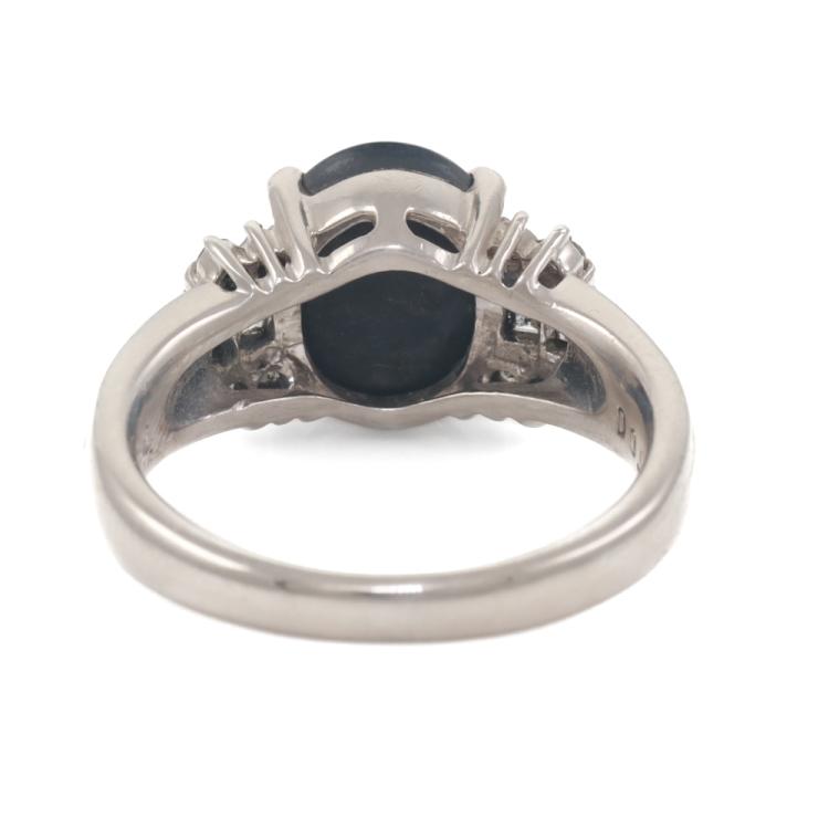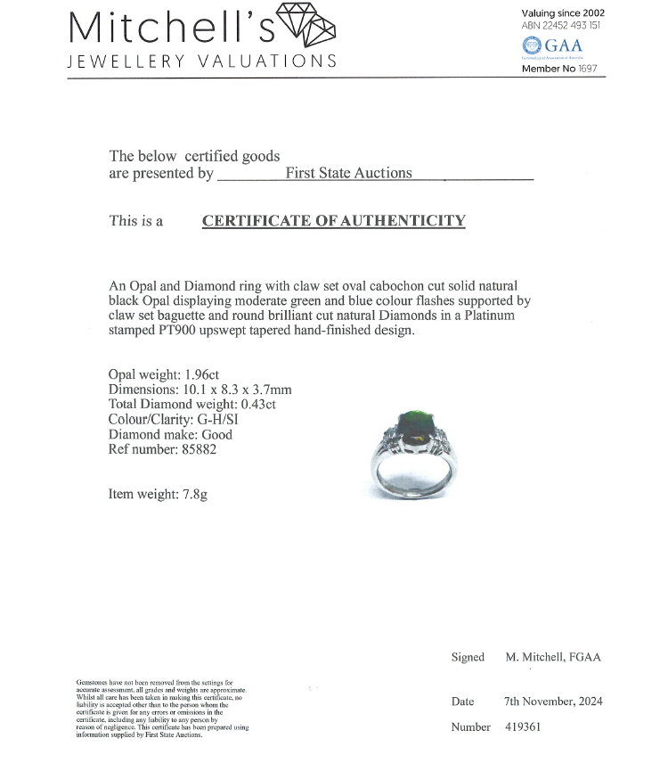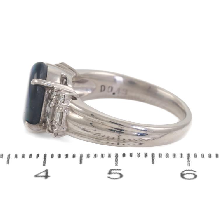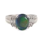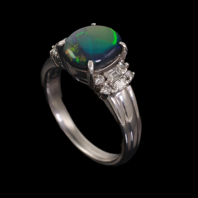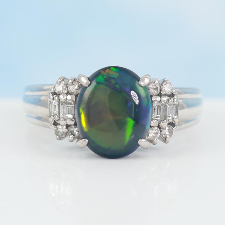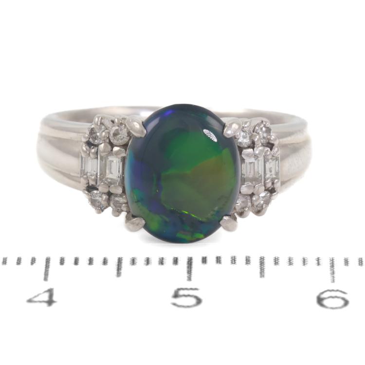 Opal and Diamond ring with oval cabochon cut solid Natural Black Opal of 1.96ct with round & baguette cut Natural Diamonds totalling 0.43ct (Estimated grading: G-H SI). Platinum-900. Ring size L1/4. Band width: 2.5mm - 5mm. Weight: 7.8g. With Certificate #419361. (Pre-owned)
