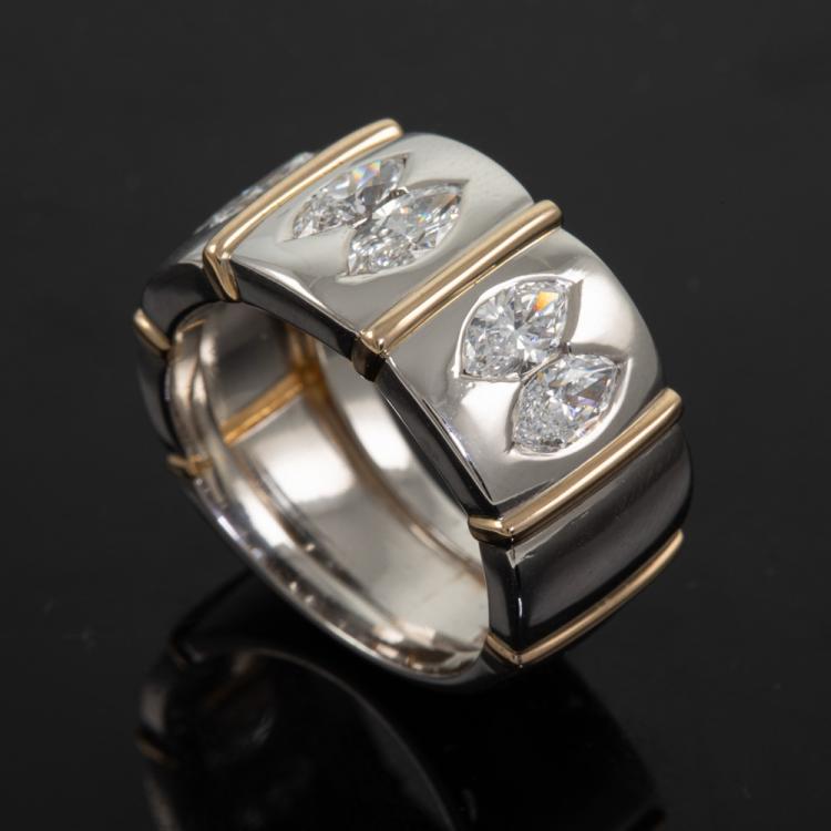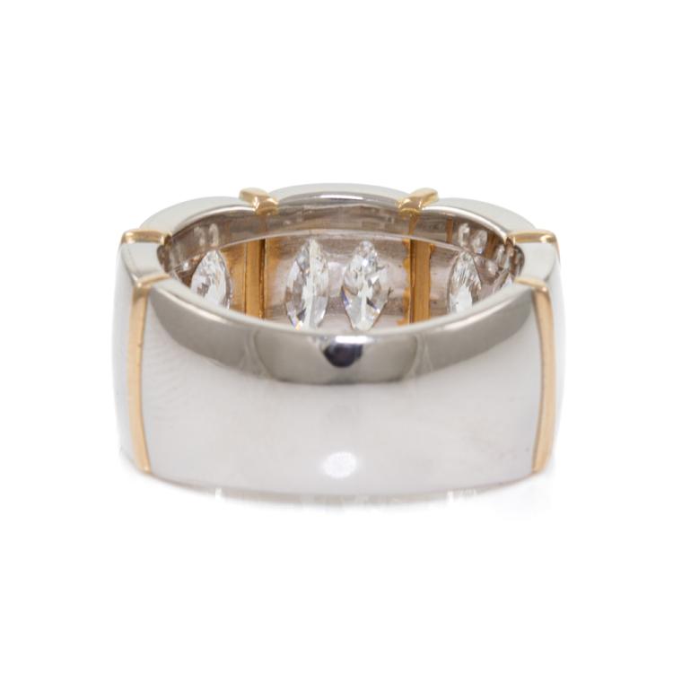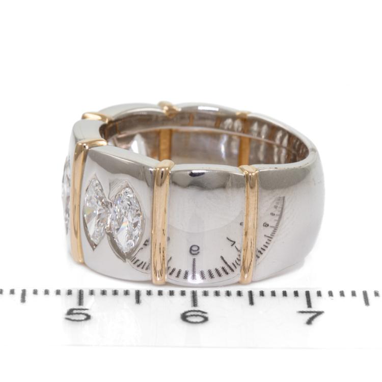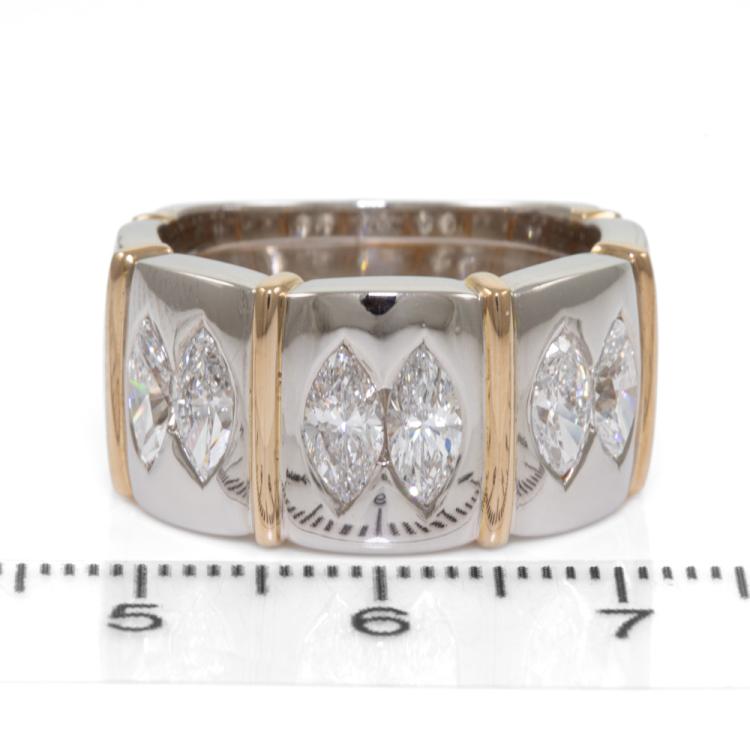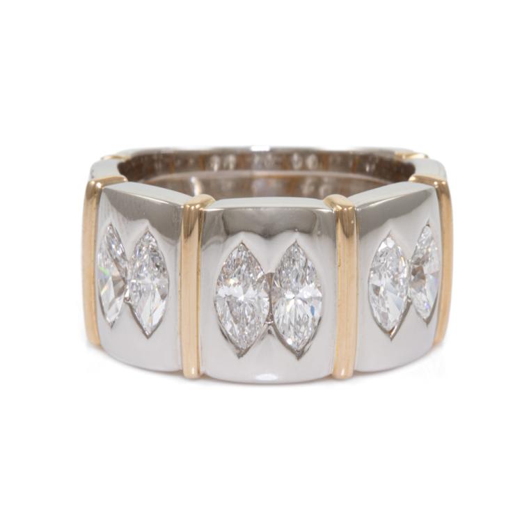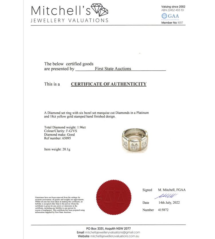 Diamond ring with 6 marquise cut Natural Diamonds totalling 1.96ct (Estimated grading: F-G VS). 18ct yellow gold and platinum. Ring size Q - ring resizing is not recommended. Weight: 20.1g. With Certificate #415872. (Pre-owned)