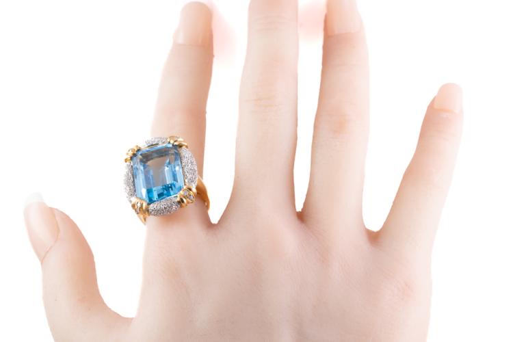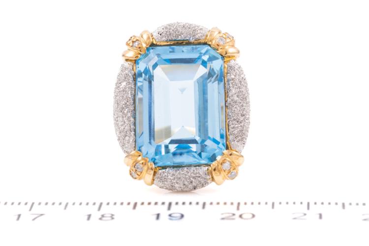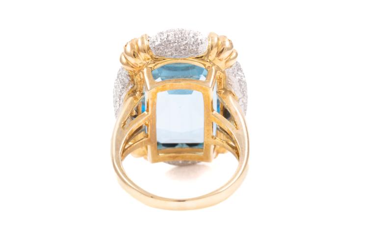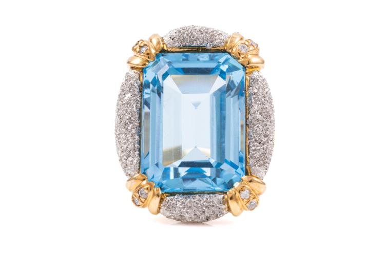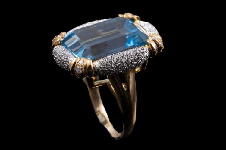 Topaz and Diamond ring with an emerald cut blue Natural Topaz of 20.00ct and 8 round Natural Diamonds totalling 0.10ct. 18ct yellow & platinum 900. Ring size M1/2. Weight: 15.8g. (Pre-owned)