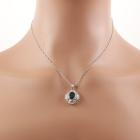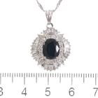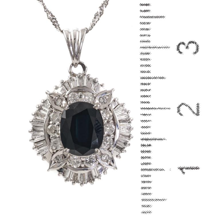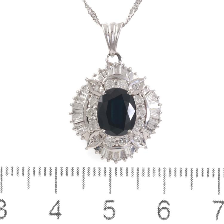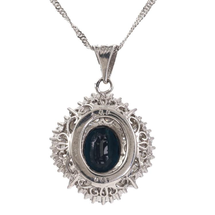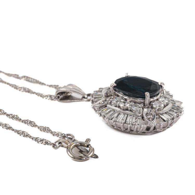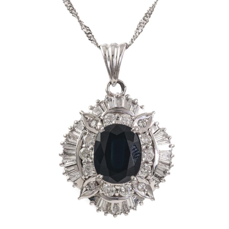 Sapphire and Diamonds pendant with oval shape Natural Blue Sapphire of 2.00ct and round & baguette cut Natural Diamonds totalling 0.85ct (Estimated grading: H-I SI-P1). Platinum - 900 with 39.5cm Platinum - 850 chain. Weight: 7.5g. (Pre-owned)