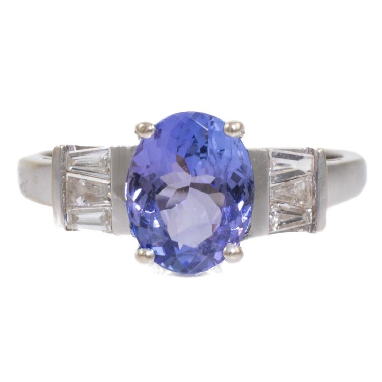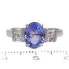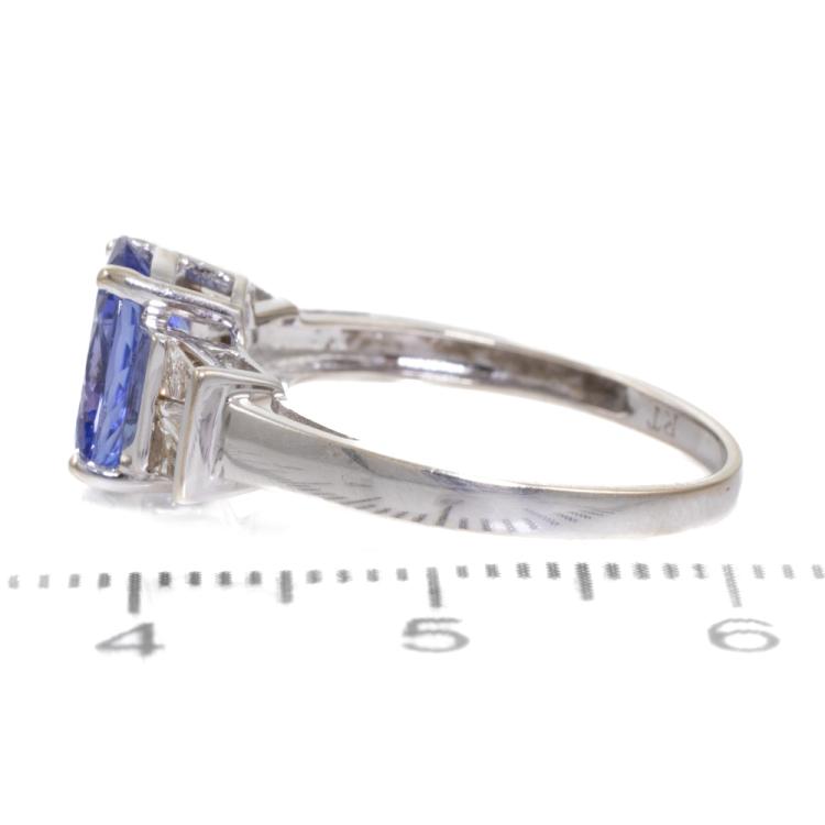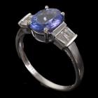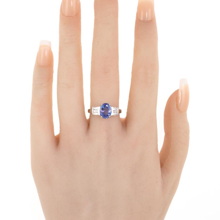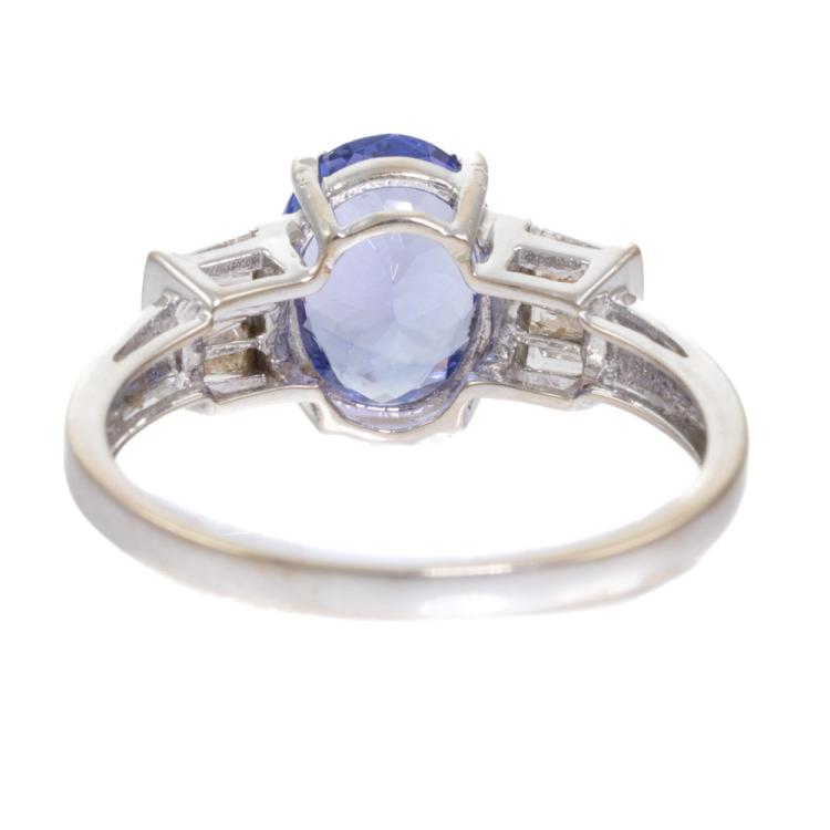Tanzanite and Diamond ring with an oval shape natural Tanzanite of 2.00ct and baguette cut natural Diamonds totalling 0.20ct. 14ct white gold. Ring size N 1/4. band width: 1.6mm-2.6mm. Weight: 2.4g. (Pre-owned)