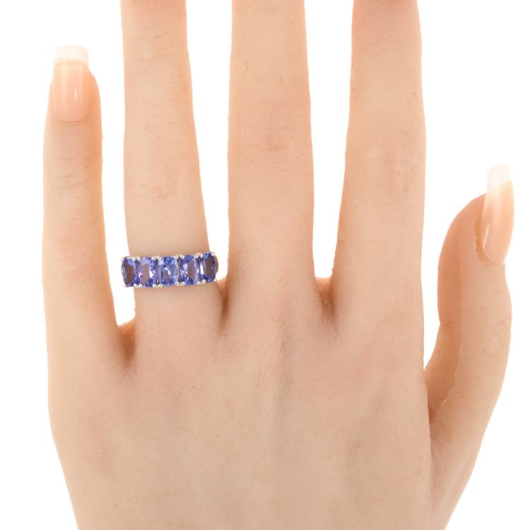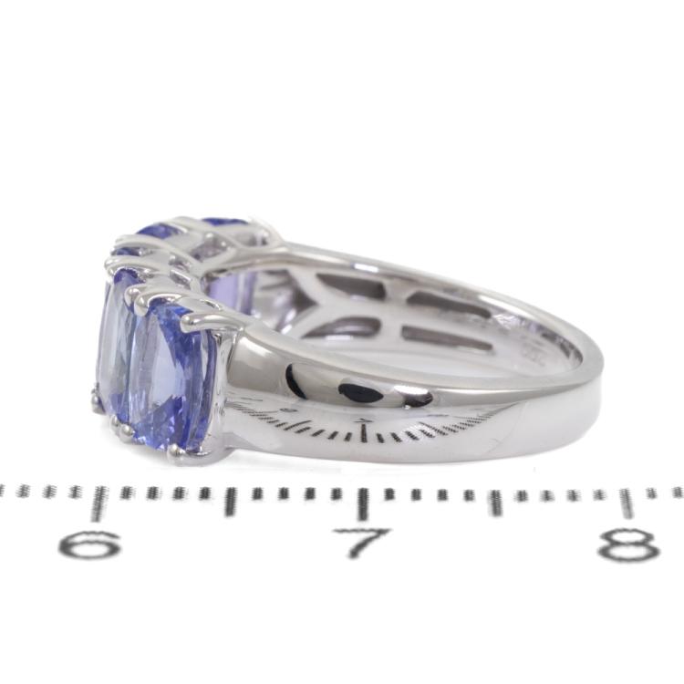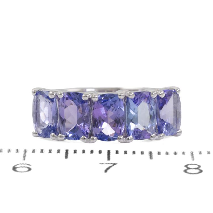 Tanzanite ring with 5 cushion cut natural Tanzanite's totalling 2.00ct. 18ct White gold. Ring size: I . Band Width: 2.6mm - 4.5mm. Weight: 5.2g. (Pre-owned)
