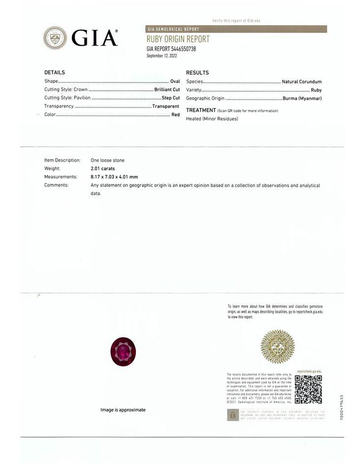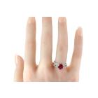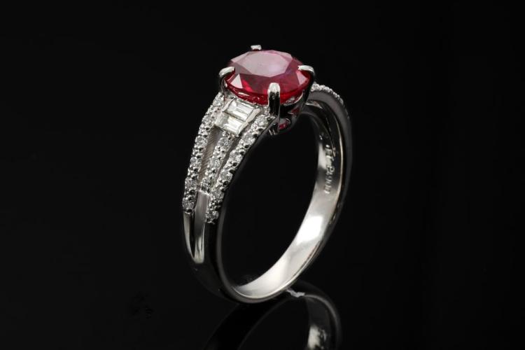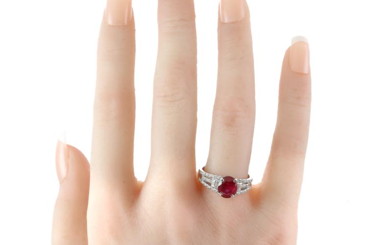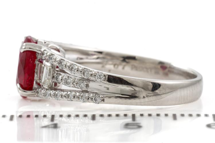 Ruby and Diamond ring with an oval shape Natural Burmese Ruby of 2.01ct and baguette cut & round Natural Diamonds totalling 0.36ct (Estimated grading: GHI SI-P1). Platinum - 900. Ring size M1/2 - ring resizing is not recommended. Weight: 6.2g. With GIA report #5446550738. (Pre-owned)