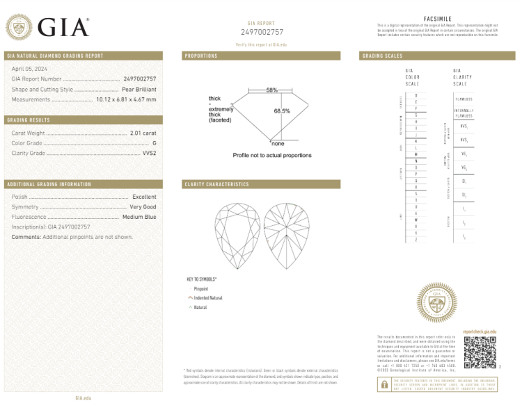 A loose pear shape Natural Diamond of 2.01ct (With GIA report graded as G VVS2 #2497002757). (New)