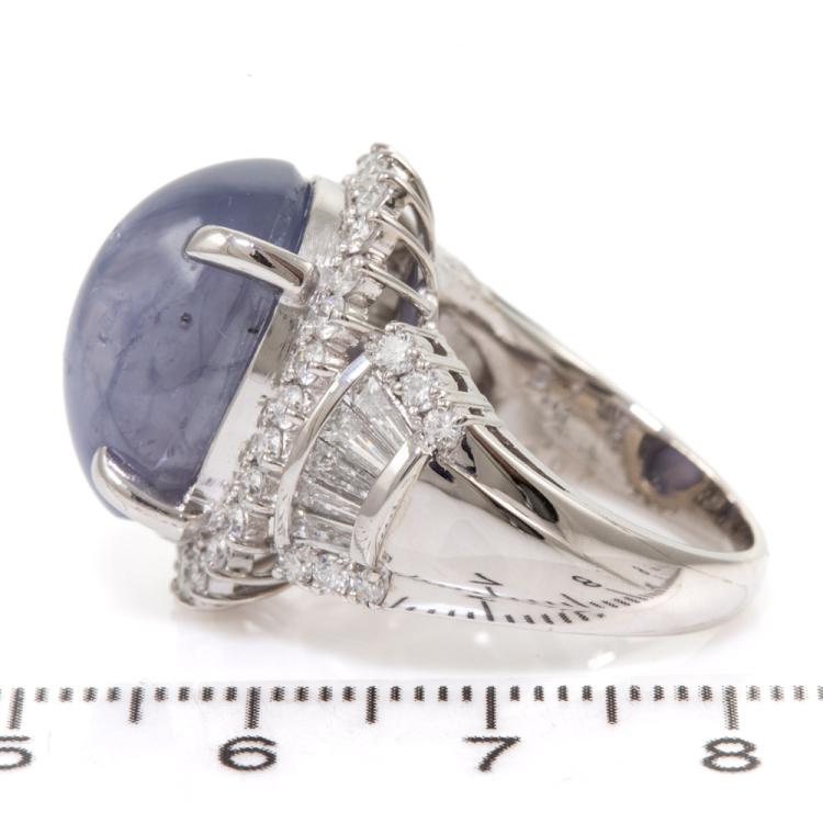 Sapphire and Diamond ring with oval cabochon cut blue Natural Star Sapphire of 20.58ct and round Natural Diamonds totalling 1.75ct (Estimated grading: G-H VS-SI). Platinum 900. Ring size M1/2. Band width: 8.1mm - 3.2mm. Weight: 23.6g. With Certificate #418071. (Pre-owned)