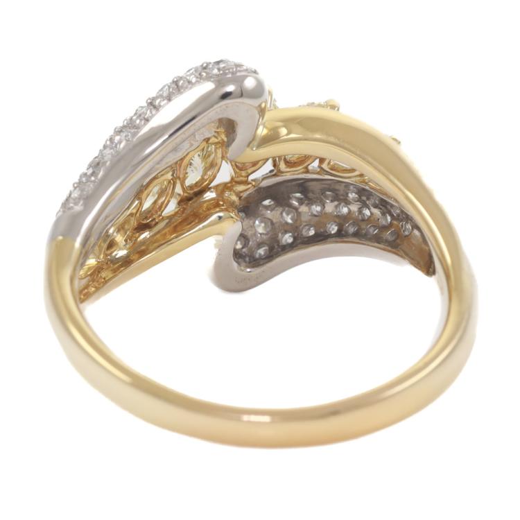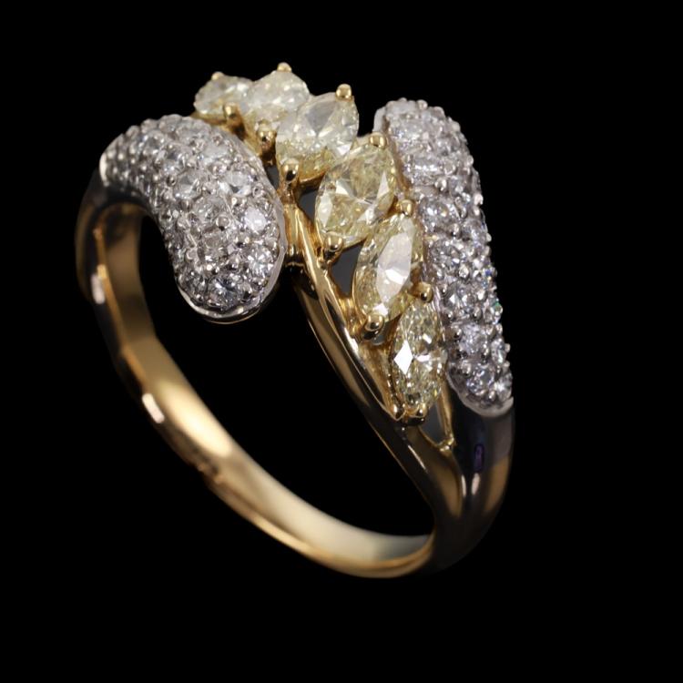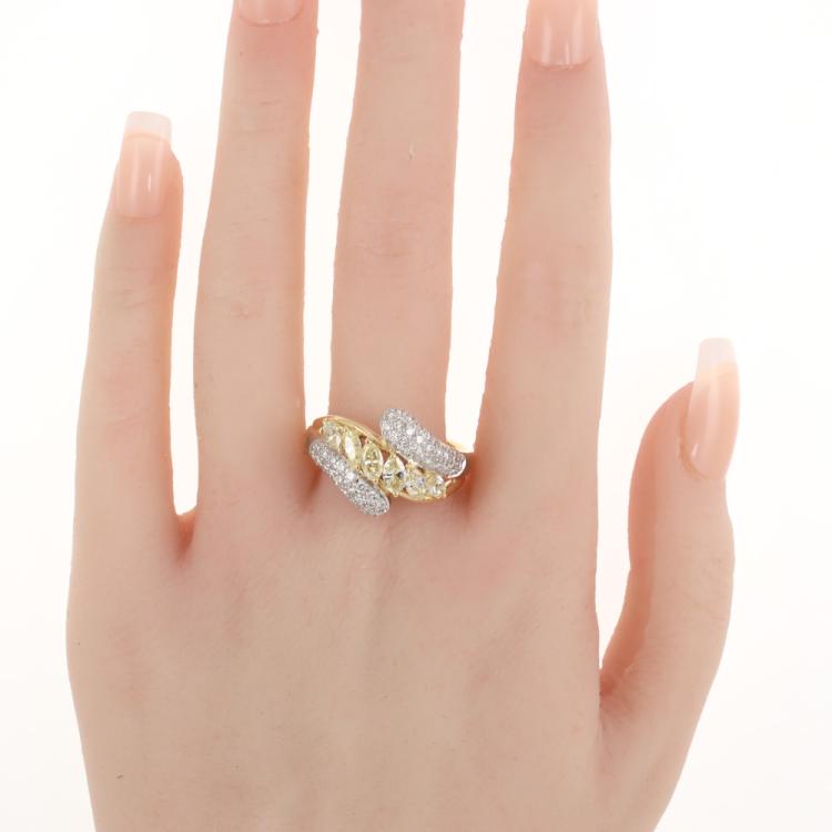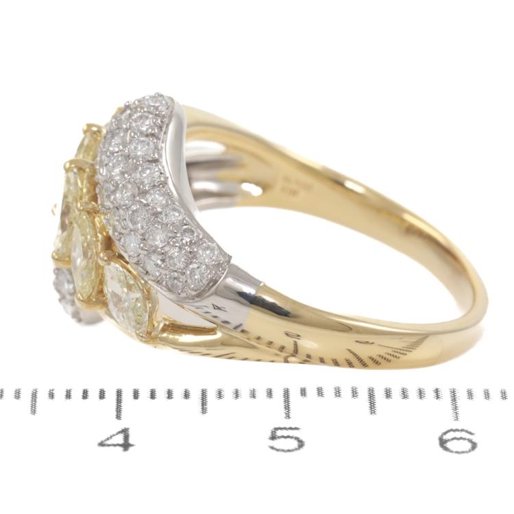 Diamond dress ring featuring a central row of six marquise-cut natural fancy yellow Diamonds, complemented by round white natural Diamonds, with a total combined carat weight of 2.05ct (Estimated grading: Fancy Yellow SI, H SI). Platinum-900 and 18ct yellow gold. Ring size U. Band width: 2.6mm - 3.6mm. Weight: 10.5g. (Pre-owned)